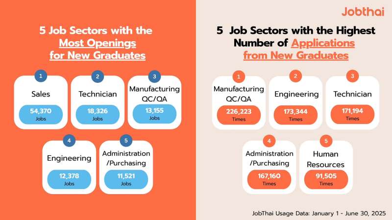 นอกจากนี้ จากการเก็บข้อมูลสถิติการสมัครงานนักศึกษาจบใหม่ในช่วงเดือนมกราคม - มิถุนายน 2568พบว่ามีตำแหน่งงานที่พร้อมเปิดรับนักศึกษาจบใหม่ 20% จากประกาศงานทั้งหมด หรือเพียง 220,000ตำแหน่ง และมีการสมัครงานของเด็กจบใหม่ 1,486,604 ครั้ง โดยสายงานที่เด็กจบใหม่สมัครมากที่สุด 1. งานผลิต/ควบคุมคุณภาพ 2. งานวิศวกรรม 3. งานช่างเทคนิค 4. งานธุรการ/จัดซื้อ 5. งานทรัพยากรบุคคล ตลอดจนสำหรับกลุ่มสายงานที่เปิดรับเด็กจบใหม่มากที่สุดได้แก่ 1.งานขาย 2.งานช่างเทคนิค 3.งานผลิต/ควบคุมคุณภาพ 4.งานวิศวกรรม 5.งานธุรการ/จัดซื้อ