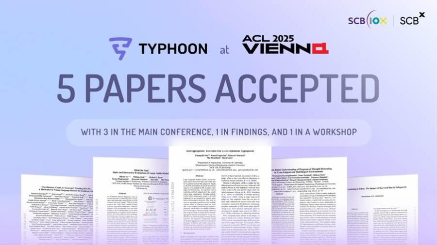 ล่าสุด ทีมวิจัย Typhoon จาก SCB 10X บริษัทด้านการลงทุนในเทคโนโลยีปฏิวัติวงการ (Disruptive Technology) ภายใต้กลุ่มเอสซีบีเอกซ์ สร้างความสำเร็จครั้งสำคัญด้วยการส่ง 5 ผลงานวิจัยร่วมด้านเทคโนโลยีปัญญาประดิษฐ์ (AI) เข้าสู่การประชุม Association for Computational Linguistics (ACL) 2025 เวทีประชุมวิชาการระดับโลกด้านการประมวลผลภาษาธรรมชาติและภาษาศาสตร์คอมพิวเตอร์ที่ทรงเกียรติที่สุดแห่งหนึ่งของโลก โดยความสำเร็จครั้งนี้เป็นผลจากความร่วมมือในการทำวิจัยร่วมกับสถาบันชั้นนำ 4 แห่ง ได้แก่ สถาบันวิทยสิริเมธี (VISTEC) มหาวิทยาลัยสแตนฟอร์ด มหาวิทยาลัยเคมบริดจ์ และเครือข่ายวิจัย SEACrowd โดยแบ่งเป็น 3 งานใน Main Conference, 1 งานใน Findings และ 1 งานใน LLM Security Workshop