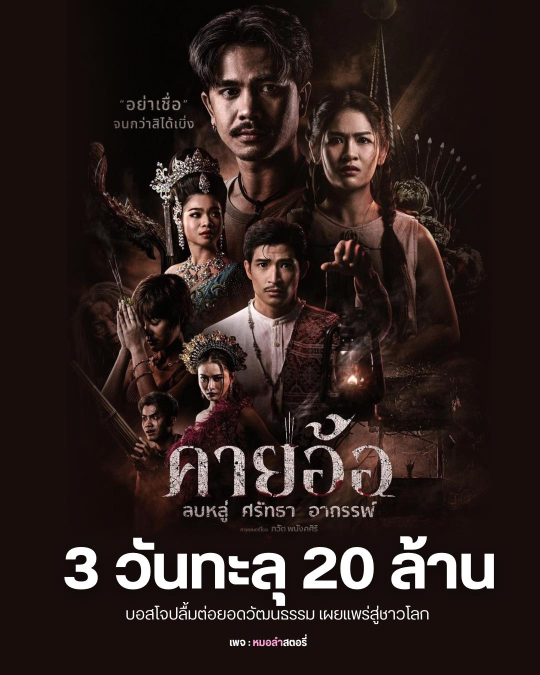 แรงตั้งแต่วันแรก ไม่มีทีท่าว่าจะแผ่วเลย กับปรากฏการณ์ รายได้เปิดตัววันแรก ทะลุ 6.5 ล้านบาท จนถึงตอนนี้ ทะลุ 20 ล้านไปแล้ว กับการเปิดประสบการณ์สัมผัสความอาถรรพ์ในวงหมอลำ “คายอ้อ” (คายอ้อ ลบหลู่ ศรัทธา อาถรรพ์) หนังผีไทย ที่กำลังถูกพูดถึงบนโลกออนไลน์ สร้างความสงสัย โดยเฉพาะอย่างยิ่ง คำว่า ”คายอ้อ” ที่ถูกนำมาตั้งเป็นชื่อภาพยนตร์ มันมีความหมายว่าอะไร