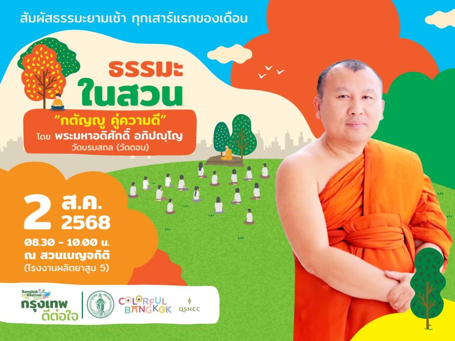 ศูนย์ฯ สิริกิติ์ ขอเชิญคุณมาหยุดพัก ฟังธรรมะ เติมพลังชีวิตเชื่อมโยงกับต้นกำเนิดแห่งความดี ในกิจกรรม “ธรรมะในสวน” หัวข้อ ‘กตัญญูคู่ความดี’ โดยพระมหาอดิศักดิ์ อภิปญฺโญ วัดบรมสถล (วัดดอน) ในเช้าวันเสาร์ที่ 2 สิงหาคม 2568 เวลา 8.30-10.00 น. ณ อาคารโรงงานผลิตยาสูบ 5 สวนเบญจกิติ