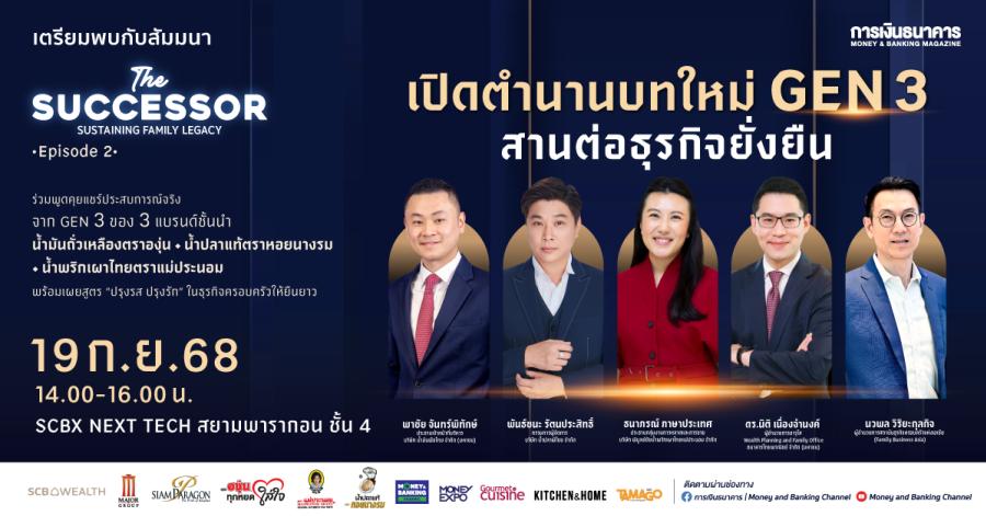 วารสารการเงินธนาคาร เตรียมจัดสัมมนาใหญ่ประจำปี The Successor : Sustaining Family Legacy “Episode 2 เปิดตำนานบทใหม่ GEN 3 สานต่อธุรกิจยั่งยืน” ในวันศุกร์ที่ 19 กันยายน 2568 เวลา 14.00-16.00 น. ณ SCB Next Tech Siam Paragon ชั้น 4 เพื่อเปิดเวทีแลกเปลี่ยนมุมมอง กลยุทธ์ และประสบการณ์ จากผู้บริหารรุ่นต่อรุ่น นักธุรกิจครอบครัว และผู้เชี่ยวชาญด้านการสืบทอดกิจการและการบริหารความมั่งคั่ง
