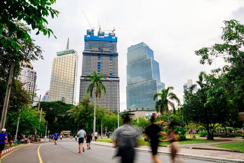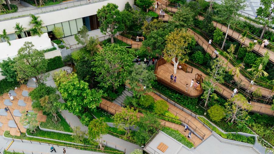 1. Roof Park 7 ไร่ – หัวใจสีเขียวใจกลางเมือง: เชื่อมต่อสวนลุมพินีอย่างไร้รอยต่อ ทำหน้าที่เป็น “ปอดใหม่ของคนเมือง” ดูดซับคาร์บอนไดออกไซด์กว่า 11 ตันต่อปี เทียบเท่าต้นไม้ใหญ่กว่า 900 ต้น ออกแบบด้วย Biophilic Design เชื่อมธรรมชาติเข้ากับไลฟ์สไตล์ โดยใช้ พืชพรรณท้องถิ่น เช่น เตย แว่นแก้ว เดหลี หญ้าถอดปล้อง และกกอเมซอน เพื่อช่วยฟอกอากาศและดักจับฝุ่น PM2.5 เสริมความหลากหลายทางชีวภาพในเมือง พร้อมเปิดพื้นที่กิจกรรมสุขภาพและคอมมูนิตี้ อาทิ Run Club, Sunrise Coffee & Tea Rave และ Wellness Experiences ที่ตอบโจทย์คุณภาพชีวิตยุคใหม่