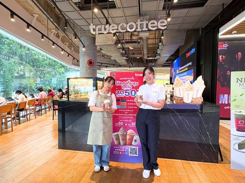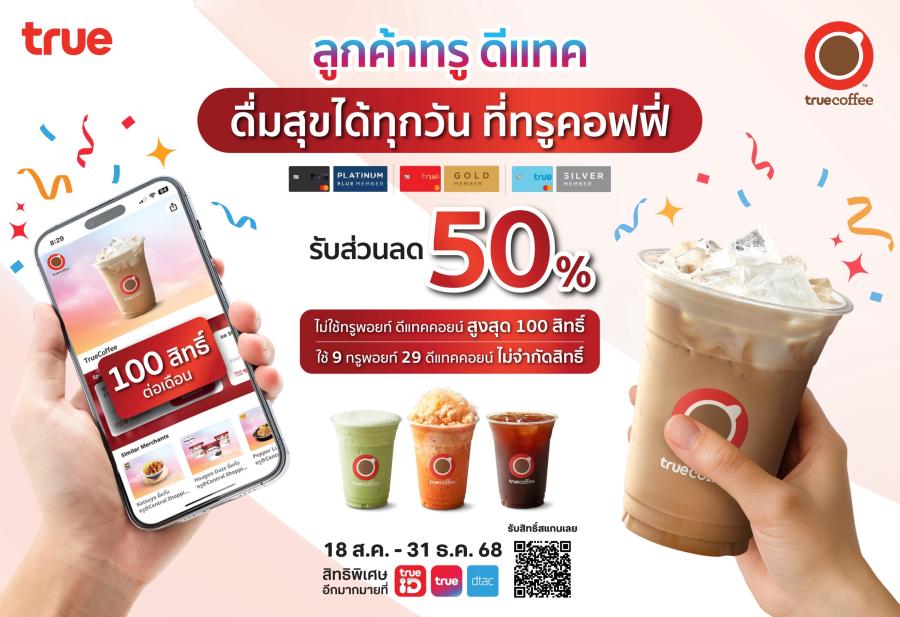 ทั้งนี้ แคมเปญ “ดื่มสุขทุกวัน ลดสูงสุด 50%”สะท้อนอีกหนึ่งความตั้งใจของทรูคอฟฟี่ที่จะเป็นมากกว่าร้านกาแฟทั่วไป เพราะที่นี่คือ “พื้นที่แห่งความสุข” ที่ผสานกาแฟคุณภาพเข้ากับสิทธิพิเศษและเทคโนโลยีผ่านทรูไอดี เชื่อมโยงลูกค้าเข้าสู่อีโคซิสของทรูอย่างครบวงจร ให้ทุกแก้วกาแฟที่คุณเลือก เติมเต็มทุกช่วงเวลาให้พิเศษกว่าที่เคย อย่าพลาดสิทธิพิเศษสุดคุ้ม ให้ทุกแก้วจากทรูคอฟฟี่กลายเป็นโมเมนต์ดี ๆ ของคุณได้ทุกวัน ตั้งแต่วันนี้ – 31 ธันวาคม 2568 ทุกสาขาทั่วประเทศ