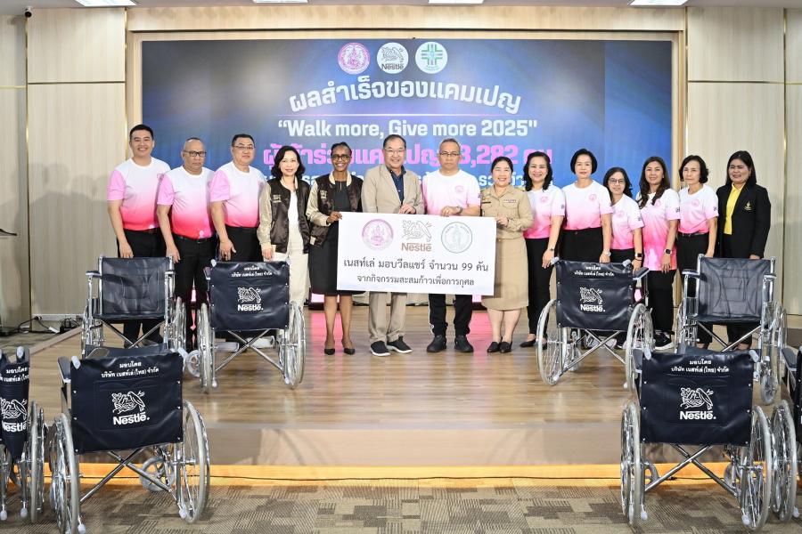 บริษัท เนสท์เล่ (ไทย) จำกัด ส่งต่อคุณภาพชีวิตที่ดีให้สังคมไทยอย่างต่อเนื่อง พร้อมส่งเสริมสุขภาพพนักงานด้วยกิจกรรมสะสมก้าวเดินเพื่อเปลี่ยนพลังกายเป็นพลังใจสู่สังคม กิจกรรม“Walk More, Give More” เป็นกิจกรรมภายในองค์กรที่จัดขึ้นเป็นปีที่ 3 โดยปีนี้นอกจากจะมีพนักงานเนสท์เล่กว่า 1,600 คนที่ร่วมสะสมก้าวแล้ว ยังได้ผนึกกำลังกับบุคลากรจากหน่วยงานพันธมิตร ได้แก่ กระทรวงการพัฒนาสังคมและความมั่นคงของมนุษย์ และสำนักอนามัย กรุงเทพมหานคร ร่วมพิชิตเป้าหมายกว่า 990ล้านก้าวได้สำเร็จ โดยทุก 10 ล้านก้าวเดิน-วิ่งเท่ากับวีลแชร์ 1 คัน นับเป็นวีลแชร์จำนวน 99 คัน มอบให้กระทรวงการพัฒนาสังคมและความมั่นคงของมนุษย์และสำนักอนามัย กรุงเทพมหานคร เพื่อร่วมเป็นส่วนหนึ่งในการส่งต่อก้าวที่มั่นคงสู่คนที่ต้องการส่งเสริมคุณภาพชีวิตที่ดีและสร้างชุมชนไทยให้เข้มแข็ง