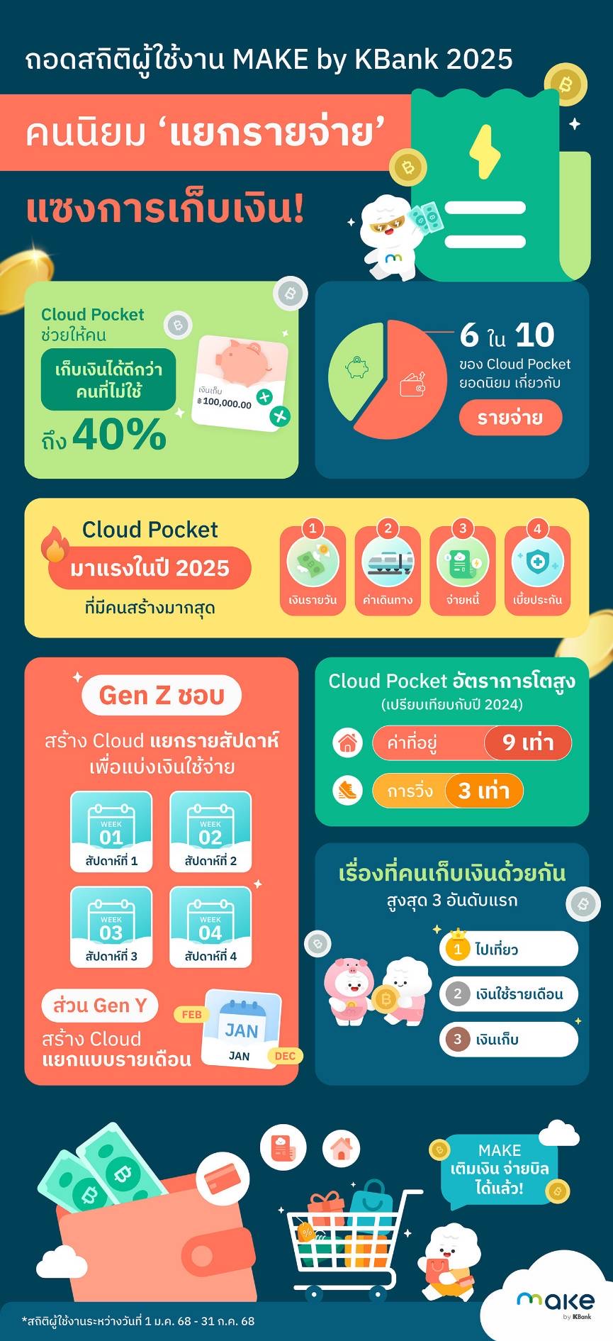 MAKE by KBank ชี้เทรนด์การเงินปี 2568 คนไทยหัน “แบ่งเงินคุมค่าใช้จ่าย” มากขึ้น หนุน Cloud Pocket นิยมต่อเนื่อง ช่วยเก็บเงินได้ดีกว่าเดิม 40%