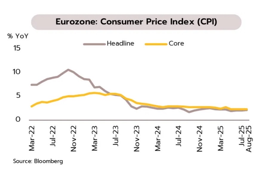 ECB ส่งสัญญาณใกล้ยุติวงจรดอกเบี้ยขาลง ขณะที่ปัญหาการเมืองในฝรั่งเศสมีโอกาสลากยาว ECB มีมติคงอัตราดอกเบี้ยที่ระดับ 2.0% ในการประชุมวันที่ 11กันยายน โดยประธาน ECB ระบุว่าความเสี่ยงต่อเศรษฐกิจมีความสมดุลมากกว่าเดิม พร้อมปรับเพิ่มคาดการณ์ GDP ปี 2568 ขึ้นจาก 0.9% สู่ระดับ 1.2% ส่วนอัตราเงินเฟ้อปีนี้คาดไว้ที่ 2.1% ก่อนปรับลดลงต่ำกว่าเป้าหมายที่ 2% ในปี 2569-70