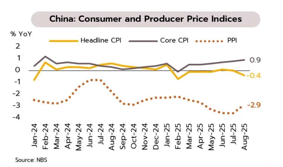 จีนเผชิญแรงกดดันจากภายนอกเพิ่มมากขึ้น การส่งออกในเดือนสิงหาคมขยายตัวต่ำสุดในรอบ 6 เดือนที่ 4.4%YoY ขณะที่การส่งออกไปยังสหรัฐฯ หดตัวเร่งขึ้นจาก -21.7% ในเดือนกรกฎาคมเป็น -33.1% ในเดือนสิงหาคม ส่วนการส่งออกไปยังคู่ค้าสำคัญอื่นยังขยายตัวได้สูง เช่น อาเซียน ( 22.5%) และสหภาพยุโรป ( 10.4%) ขณะเดียวกันอัตราเงินเฟ้อทั่วไปยังคงต่ำกว่า 1% นานติดต่อกัน 30 เดือน อีกด้านหนึ่ง เม็กซิโกประกาศขึ้นภาษีนำเข้าสินค้าจากจีนเป็น 50% สำหรับรถยนต์ 35% สำหรับเหล็ก ของเล่นและมอร์เตอร์ไซด์ และ 10-50% สำหรับสิ่งทอ