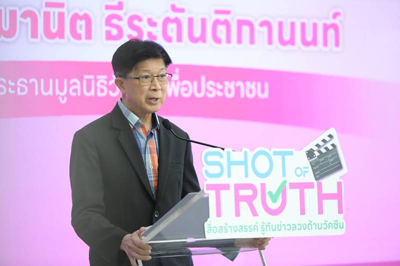 นพ.มานิต ธีระตันติกานนท์ ประธานกรรมการมูลนิธิวัคซีนเพื่อประชาชน กล่าวว่า “ปัจจุบันข้อมูลบิดเบือนและข่าวปลอมที่แพร่หลายในสังคมออนไลน์ ทำให้ประชาชนเกิดความลังเลในการรับวัคซีน ตอกย้ำถึงความจำเป็นที่เราจะต้องช่วยกันสร้างความรู้เท่าทันสื่อและข่าวลวงด้านวัคซีน มูลนิธิวัคซีนเพื่อประชาชน จึงได้ร่วมกับ สถาบันวัคซีนแห่งชาติ และภาคีเครือข่ายทั้งภาครัฐและเอกชน ขับเคลื่อนโครงการ ”Shot of Truth สื่อสร้างสรรค์ รู้ทันข่าวลวงด้านวัคซีน”เพื่อมุ่งสร้างความตระหนักของการสื่อสารข้อมูลที่ถูกต้องด้านวัคซีน ความรู้เกี่ยวกับโรคติดเชื้อในระบบทางเดินหายใจ ตลอดจนรับมือกับข้อมูลบิดเบือนที่เผยแพร่ผ่านสื่อสังคมออนไลน์ เพื่อเสริมสร้างความรู้เท่าทันข่าวลวงด้านวัคซีน ผ่านพลังคนรุ่นใหม่ในกิจกรรมการประกวดคลิปวิดีโอสั้น ถือเป็นเครื่องมือสำคัญในการสื่อสารเพื่อเข้าถึงประชาชนวงกว้าง เปิดโอกาสให้นักเรียน นักศึกษา ที่สนใจด้านการผลิตสื่อได้แสดงศักยภาพทางความคิดสร้างสรรค์ ถ่ายทอดมุมมองใหม่ๆ รวมถึงใช้สื่อออนไลน์อย่างมีคุณค่า เป็นจุดเริ่มต้นสำคัญในการสร้างภูมิคุ้มกันข่าวลวงให้กับสังคมไทย ร่วมกันปกป้องสังคมจากภัยไซเบอร์ ช่วยให้ประชาชนตัดสินใจด้านสุขภาพได้อย่างถูกต้อง”
