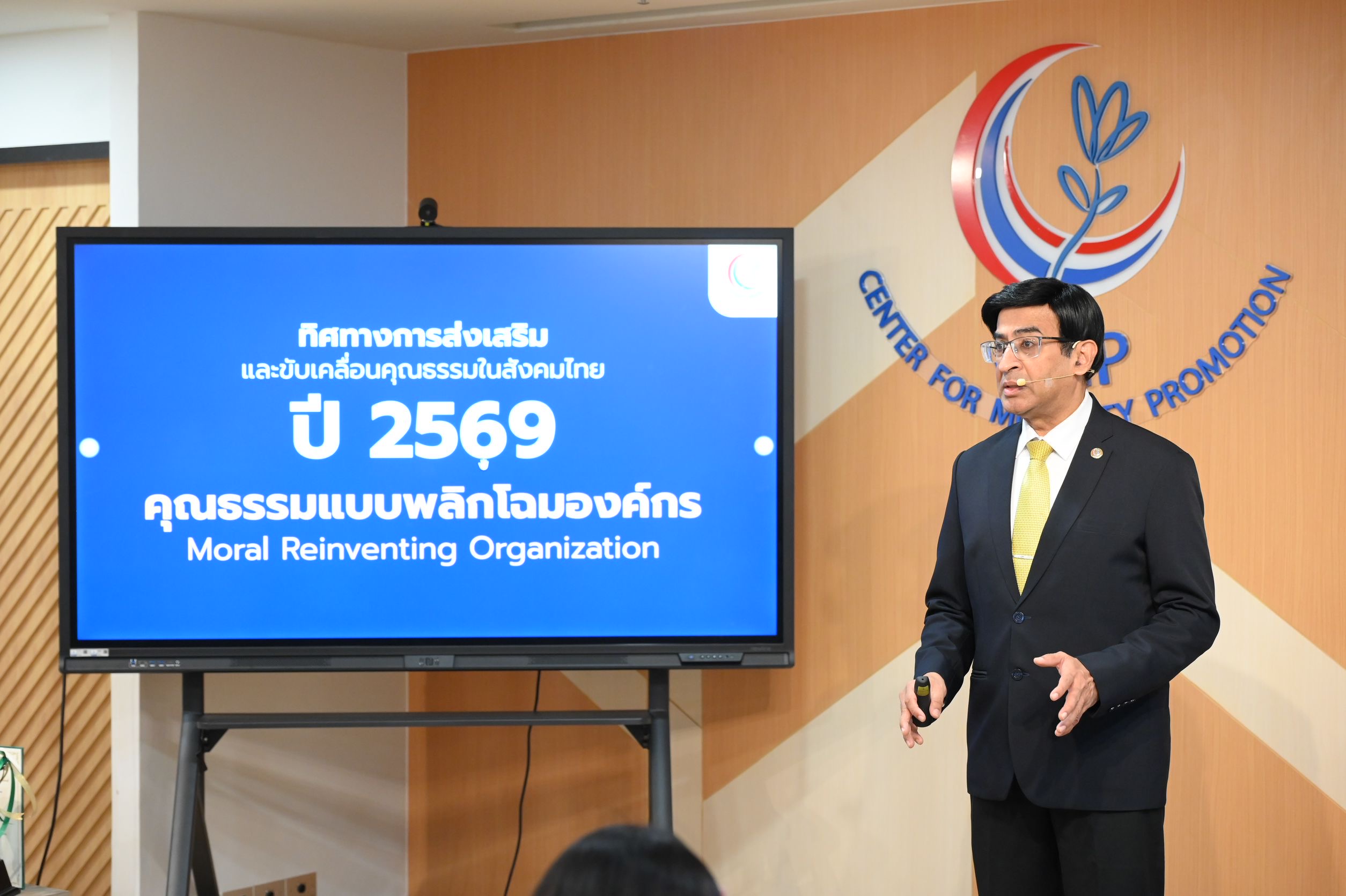 รศ.นพ.สุริยเดว ทรีปาตี ผู้อำนวยการศูนย์คุณธรรม กล่าวถึงก้าวต่อไปของศูนย์คุณธรรม โดยได้กำหนดทิศทางส่งเสริมและขับเคลื่อนคุณธรรมในสังคมไทยปี 2569 ภายใต้บริบทการพัฒนาประเทศตามยุทธศาสตร์ชาติและเป้าหมายการพัฒนาที่ยั่งยืน (SDGs) ด้วยกลไกคุณธรรมแบบพลิกโฉมองค์กร (Moral Reinventing Organization) เน้นการบูรณาการองค์กรต่อองค์กร ในรูปแบบสร้างสรรค์ ตรงตามจริตของแต่ละองค์กรและส่งเสริมการมีส่วนร่วมของทุกคน