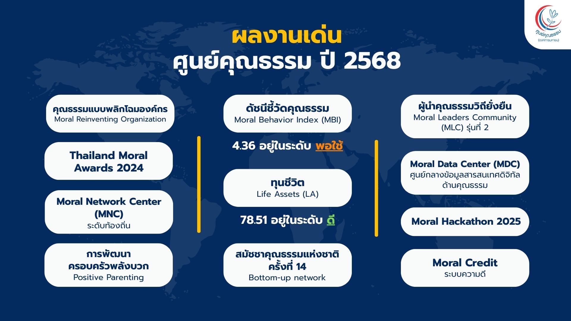 ศูนย์คุณธรรมยังคงขับเคลื่อนคุณธรรมในสังคมไทยอย่างเข้มข้น ผ่านเครือข่ายบุคคล ชุมชน และองค์กร พร้อมบริหารจัดการองค์ความรู้และนวัตกรรมคุณธรรมที่วัดผลได้และนำไปใช้จริง ทั้งในเชิงนโยบายและสาธารณะ โดยในปีนี้(2568) ศูนย์คุณธรรมดำเนินงานเชิงรูปธรรมกว่า 10 ผลงาน อาทิ การสำรวจดัชนีชี้วัดคุณธรรมและทุนชีวิต การจัดทำศูนย์กลางข้อมูลคุณธรรม Moral Data Center (MDC) และอีกหลากหลายผลงาน เร่งส่งเสริมสังคมไทยสู่สังคมคุณธรรม พร้อมวางแผนขับเคลื่อนปี 2569 ด้วยกลไกคุณธรรมแบบพลิกโฉมองค์กร(Moral Reinventing Organization) มุ่งสร้างระบบนิเวศคุณธรรมให้เติบโต ตั้งแต่ระดับครอบครัว ชุมชน องค์กร และสังคมไทยโดยรวม
