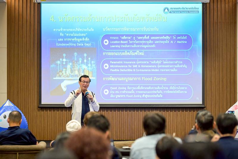 ในส่วนของการบริหารความเสี่ยงด้านทรัพย์สิน ดร.สมพร กล่าวว่า การพัฒนานวัตกรรมการประกันภัยทรัพย์สิน โดยเฉพาะในด้าน Flood Zoning ที่สามารถแบ่งพื้นที่ความเสี่ยงได้อย่างเป็นระบบ เพื่อนำมาใช้เป็นฐานในการคำนวณเบี้ย การออกแบบกรมธรรม์ และการบริหารพอร์ตการประกัน โดยมีข้อเสนอให้จัดทำ Digital Flood Risk Map ที่อัปเดตข้อมูลได้แบบ Real-Time และสามารถใช้งานร่วมกันระหว่างภาครัฐและภาคเอกชน พร้อมทั้งส่งเสริมการพัฒนาเทคโนโลยี IoT และ ระบบสารสนเทศภูมิศาสตร์ (Geographic Information System: GIS) เพื่อสนับสนุนการประเมินความเสี่ยงเชิงพื้นที่
