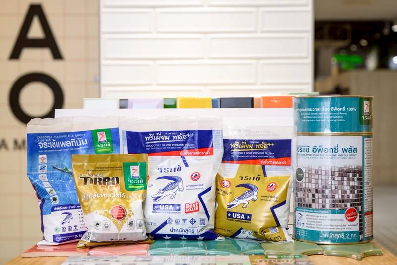 • กาวปูและยาแนวกระเบื้อง จระเข้ อีพ็อกซี่ พลัสเป็นผลิตภัณฑ์มาตรฐานอเมริกาที่สามารถเป็นทั้งกาวปูและยาแนวกระเบื้องได้ในตัว เหมาะสำหรับพื้นที่ที่ต้องการความทนทานและความสะอาดเป็นพิเศษ ปลอดภัยต่อสุขภาพ ใช้ได้กับวัสดุพิเศษต่างๆ เช่น โมเสกแก้ว หินอ่อนแท้ หินธรรมชาติ มีให้เลือก 17 เฉดสี