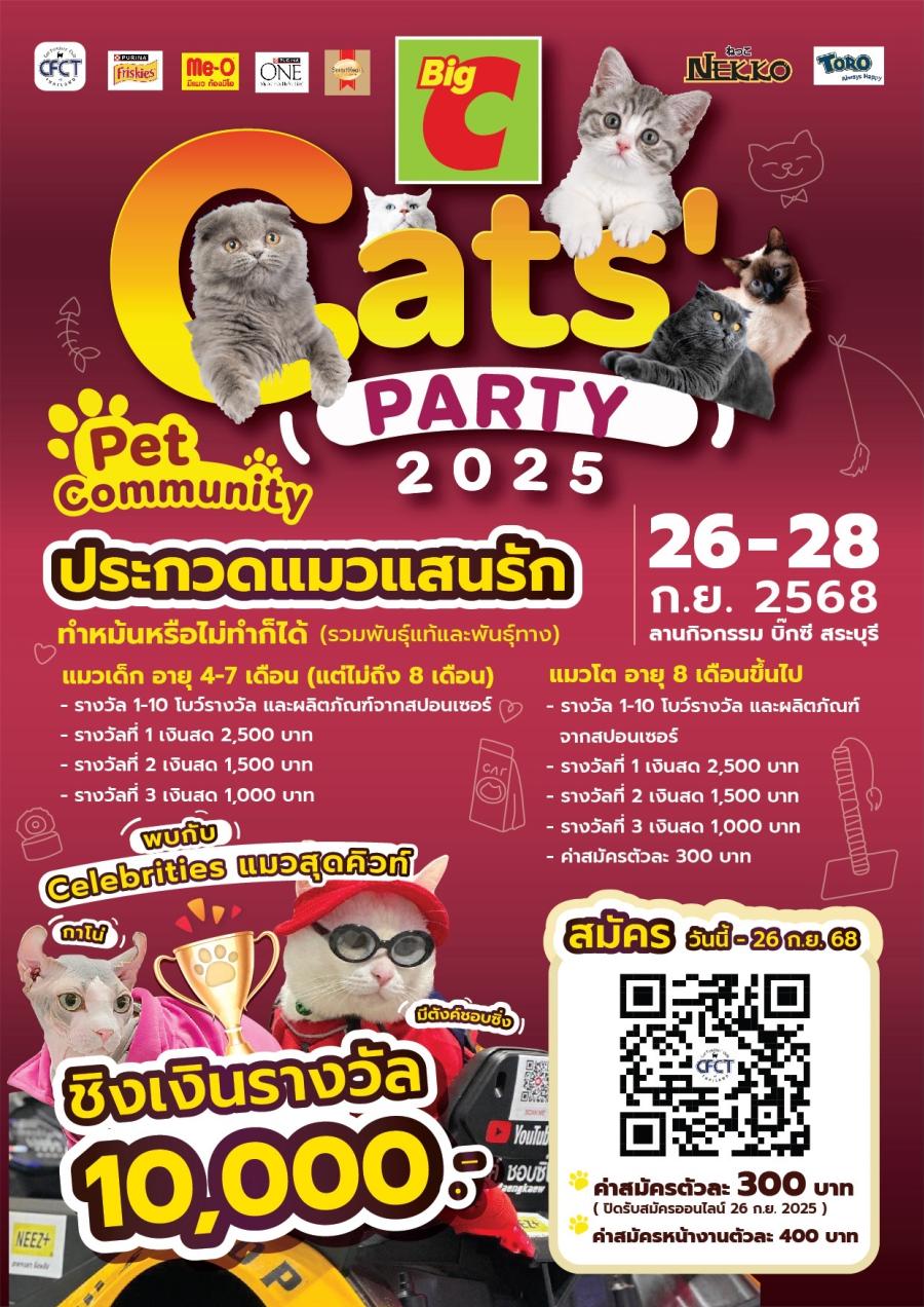 บิ๊กซี ร่วมกับ พันธมิตร จัดงาน CATS’ PARTY 2025 ประกวดแมวแสนรัก ชิงเงินรางวัลมูลค่า 10,000 บาท ระหว่างวันที่ 26-28 กันยายน 2568 ที่ บิ๊กซี สาขาสระบุรี