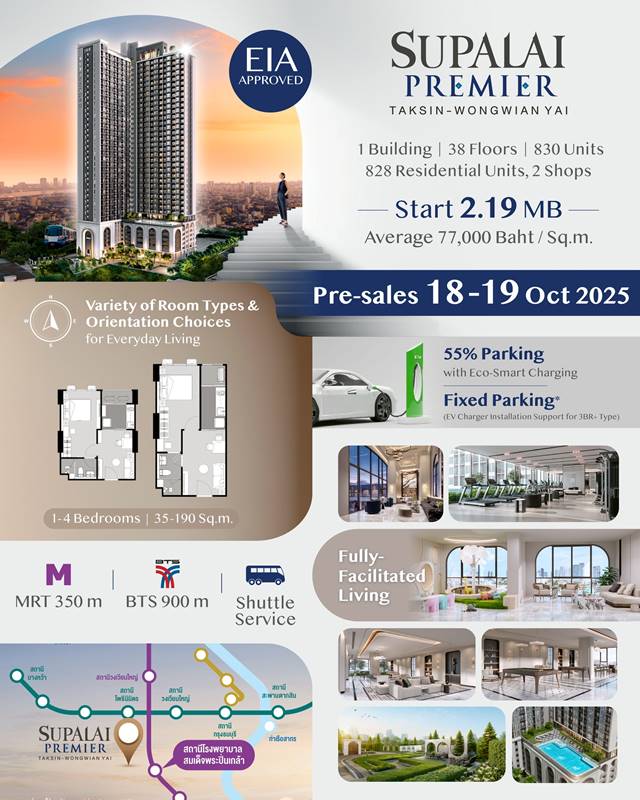 หลังปิดการขาย “ศุภาลัย เอลีท สุขุมวิท 39” อย่างรวดเร็วทันทีที่เปิดตัวเมื่อเดือนสิงหาคมที่ผ่านมา ล่าสุด บมจ.ศุภาลัย ไม่หยุดเดินเกม ส่งไม้ต่อด้วย “ศุภาลัย พรีเมียร์ ตากสิน–วงเวียนใหญ่” คอนโดมิเนียมใหม่บนทำเลศักยภาพฝั่งธนบุรี วางหมากบนทำเลเชื่อมโครงข่ายคมนาคมเหนือ–ใต้ และตะวันออก–ตะวันตก พร้อมจับจังหวะเสร็จทันรถไฟฟ้า MRT สายสีม่วงใต้ปี 2572 เจาะตลาดคอนโดฯ ระดับกลางบนที่ซัพพลายจำกัด แต่ดีมานด์ยังแข็งแรง ชูจุดขายราคาเริ่มต้น 2.19-18 ล้านบาท สร้างมูลค่าเพิ่มทั้งการอยู่อาศัยและโอกาสลงทุน อีกทั้งโครงการยังผ่านการพิจารณาการประเมินผลกระทบสิ่งแวดล้อม (EIA) เรียบร้อยแล้ว