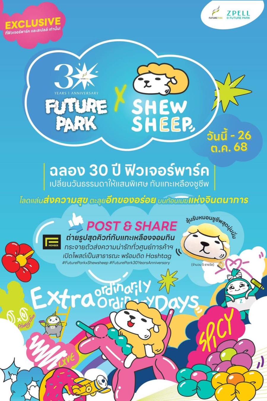 ศูนย์การค้าฟิวเจอร์พาร์คและสเปลล์ ฉลองครบรอบ 30 ปี เดินหน้าสร้างรอยยิ้มแห่งความสุขอย่างต่อเนื่อง ภายใต้แนวคิด “วันธรรมดาที่แสนพิเศษ” ประกาศจับมือศิลปินไทยสุดอาร์ต ป๊อป-สุมิตร สีมากุล ดีไซเนอร์เจ้าของคาแรคเตอร์ SHEWSHEEP (ชูชีพ) เจ้าแกะจอมกินเก่งผู้โด่งดังจากเพจ Eat All Day ที่มีเหล่าแฟนคลับติดตามมากมายทั้งไทยและต่างประเทศ ร่วมส่งมอบประสบการณ์พิเศษให้กับลูกค้า ด้วยการออกแบบคาแรกเตอร์ใหม่สุดเอ็กซ์คลูซีฟเพื่อฟิวเจอร์พาร์คและสเปลล์โดยเฉพาะ เริ่มตั้งแต่แคมเปญ Art Toy & Sneaker ต่อด้วย Foodie Tubbie และล่าสุด Installation Art ผลงาน Collaborate กับความน่ารักของ “SHEWSHEEP” หรือ “ชูชีพ” นำมาเชื่อมโยงไลฟ์สไตล์กับมาสคอตฟิวเจอร์พาร์คและสเปลล์ “น้องฟิวและน้องเปล” สุดคิ้วท์ได้อย่างลงตัว โดยเนรมิตสีสันความสุขบนก้อนเมฆแห่งจินตนาการ ส่งต่อแรงบันดาลใจ พร้อมออกตามหาความสุขผ่านของกินแสนอร่อย ทั่วทั้งศูนย์การค้าฯ ตั้งแต่วันนี้ - 28 ตุลาคม 2568 ณ ศูนย์การค้าฟิวเจอร์พาร์คและสเปลล์