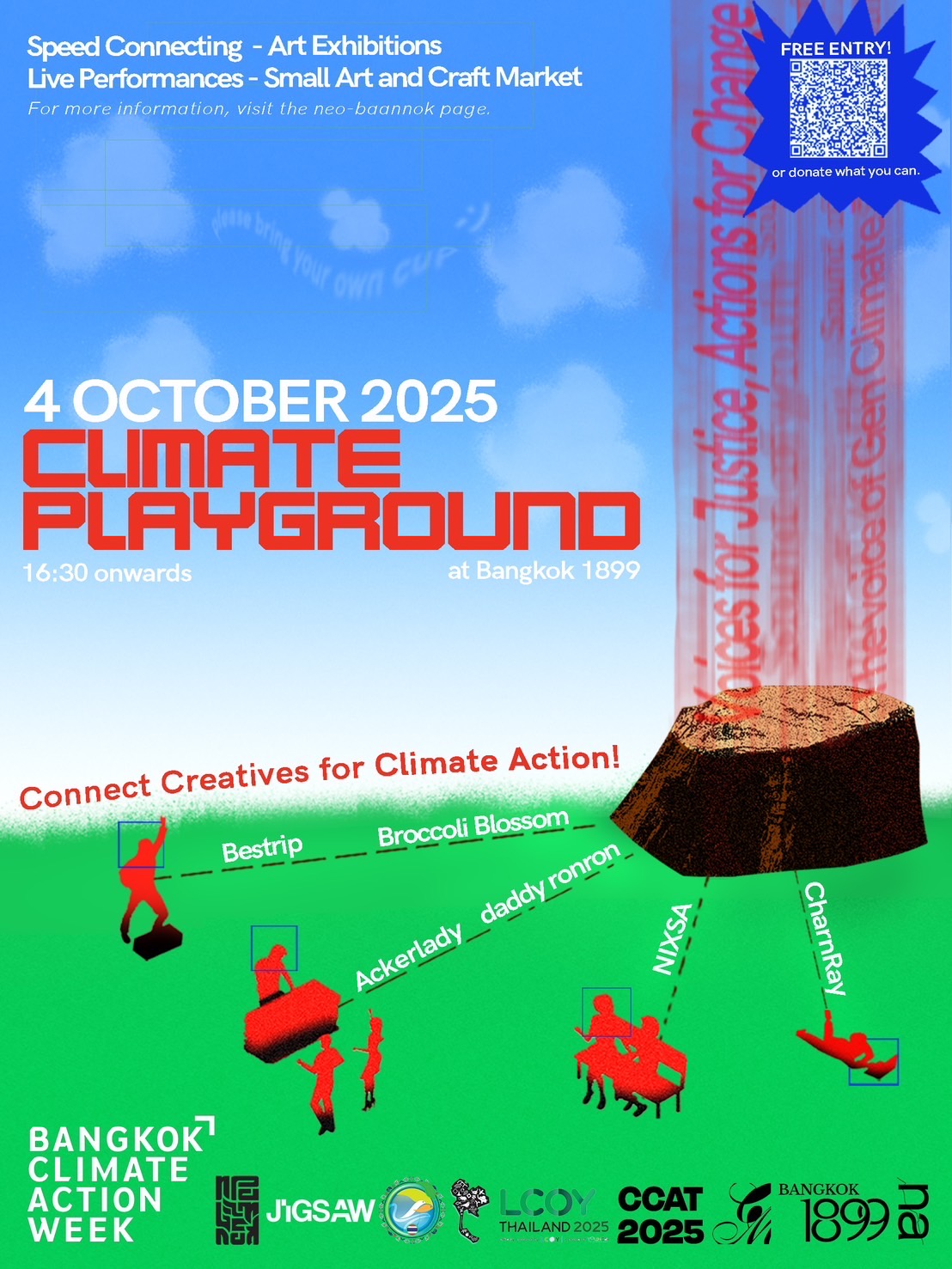 จึงขอเชิญชวนทุกภาคส่วนร่วมงาน Climate Playground: Connect Creatives for Climate Action จะจัดขึ้นในวันเสาร์ที่ 4 ตุลาคม 2025 ตั้งแต่เวลา 16.30 น. เป็นต้นไป ณ Bangkok 1899
