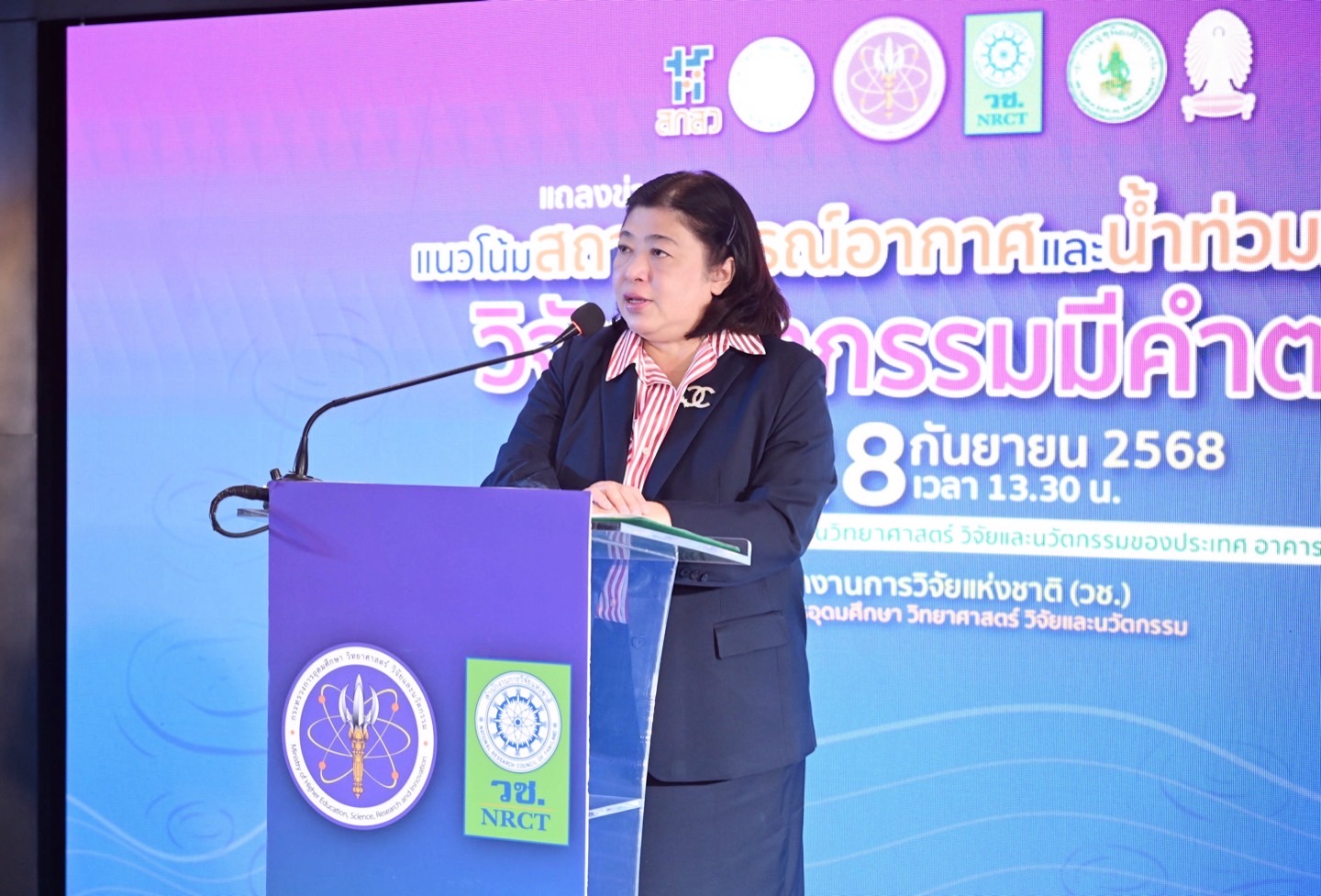 วันที่ 28 กันยายน 2568 สำนักงานการวิจัยแห่งชาติ(วช.) กระทรวงการอุดมศึกษา วิทยาศาสตร์ วิจัยและนวัตกรรม ร่วมกับเครือข่ายวิจัย ประกอบด้วย จุฬาลงกรณ์มหาวิทยาลัย มหาวิทยาลัยเกษตรศาสตร์ และกรมอุตุนิยมวิทยา จัดกิจกรรมแถลงข่าว “แนวโน้มสถานการณ์อากาศและน้ำท่วมในภาคกลาง วิจัยนวัตกรรมมีคำตอบ” โดย ดร.วิภารัตน์ ดีอ่อง ผู้อำนวยการสำนักงานการวิจัยแห่งชาติ เป็นประธาน ณ ศูนย์ข้อมูลสารสนเทศกลางด้านวิทยาศาสตร์ วิจัยและนวัตกรรมของประเทศ วช.