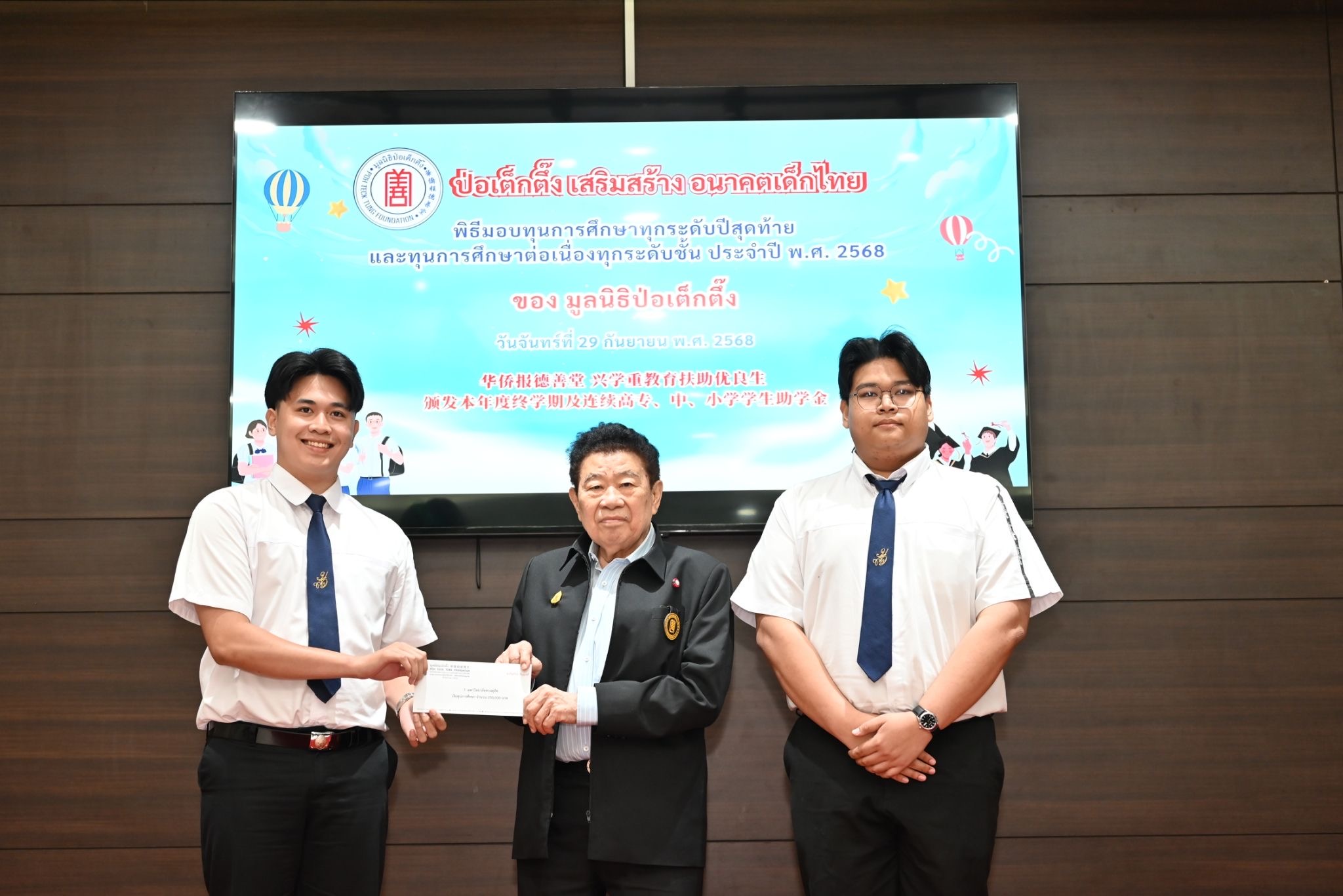 วันนี้ (วันจันทร์ที่ 29 กันยายน พ.ศ. 2568) มูลนิธิป่อเต็กตึ๊ง นำโดย นายสัก กอแสงเรือง รองประธานกรรมการ เป็นประธานในพิธี พร้อมด้วย นายวิชิต ชินวงศ์วรกุล รองประธานกรรมการ นายวิรุฬ เตชะไพบูลย์ ที่ปรึกษาประธานกรรมการ นายจารุรัตน์ คุณัตถานนท์ กรรมการและเหรัญญิก นายสุรพงษ์ เตชะหรูวิจิตร กรรมการและรองเลขาธิการ คณะกรรมการมูลนิธิฯ และผู้ช่วยกรรมการมูลนิธิฯ ร่วมในพิธีมอบทุนการศึกษาทุกระดับปีสุดท้าย และทุนการศึกษาต่อเนื่องทุกระดับชั้น ประจำปี 2568 ให้แก่นักเรียน นักศึกษาที่ประพฤติดีแต่ขาดแคลนทุนทรัพย์ในระดับชั้นมัธยมศึกษา อาชีวศึกษา และอุดมศึกษา รวม 156 สถาบัน จำนวน 910 ทุน รวมเป็นจำนวนเงิน 12,615,000 บาท (สิบสองล้านหกแสนหนึ่งหมื่นห้าพันบาทถ้วน) โดยมี เยาวชน และผู้แทนจากสถาบันการศึกษา เป็นตัวแทนรับมอบ ณ ห้องประชุมชั้น 2 อาคาร 2 มูลนิธิป่อเต็กตึ๊ง พลับพลาไชย กรุงเทพฯ