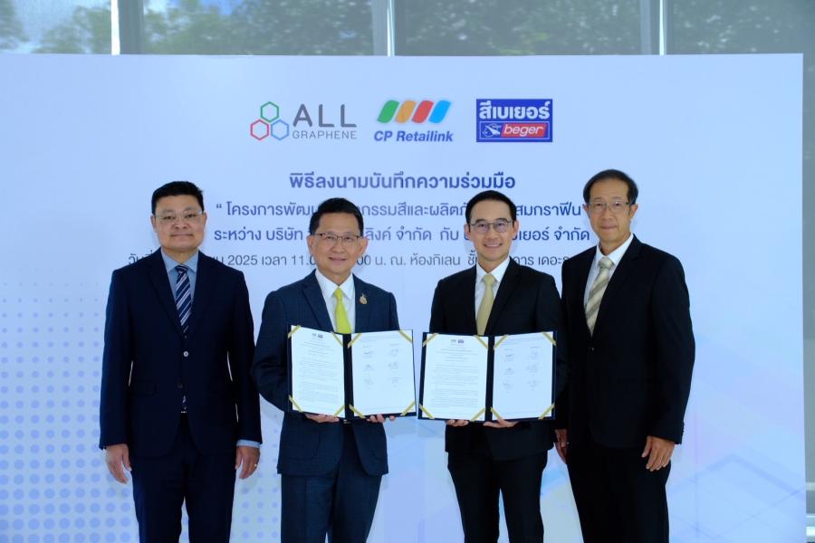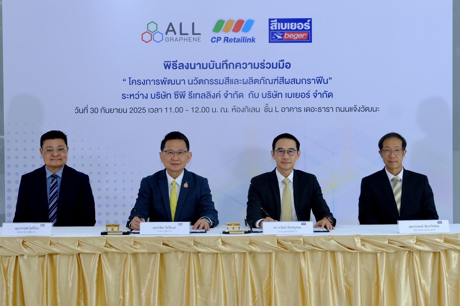 กรุงเทพฯ – 30 กันยายน 2568 – บริษัท เบเยอร์ จำกัด (Beger) ผู้นำด้านนวัตกรรมสีทาอาคารและเคมีภัณฑ์ก่อสร้างของไทย ร่วมกับ บริษัท ซีพี รีเทลลิงค์ จำกัด (CP Retailink) ผู้นำโซลูชันระบบค้าปลีกและผู้พัฒนาวัสดุกราฟีน ลงนามบันทึกข้อตกลงความร่วมมือทางวิชาการ (MOU) เพื่อพัฒนา “Graphene for Paint Technology”นวัตกรรมใหม่สำหรับสีรุ่นใหม่ที่ต่อยอดการใช้วัสดุกราฟีนในอุตสาหกรรมสีและเคมีภัณฑ์ก่อสร้าง ณ ห้องกิเลน ชั้น L เดอะ ธารา แจ้งวัฒนะ