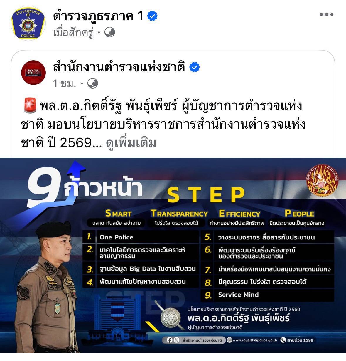 3.) พล.ต.อ.กิตติ์รัฐ พันธุ์เพ็ชร์ ผู้บัญชาการตำรวจแห่งชาติ มอบนโยบายบริหารราชการสำนักงานตำรวจแห่งชาติ ปี 2569 “1 ยึดมั่น 6 เร่งรัด 9 ก้าวหน้า” 9 ก้าวหน้าได้ด้วย STEP Smart : ฉลาด ทันสมัย สง่างาม Transparency : โปร่งใส ตรวจสอบได้ Efficiency : ทำงานอย่างมีประสิทธิภาพ People : ยึดประชาชนเป็นศูนย์กลาง 9 ก้าวหน้า “เราจะก้าวไปด้วยกัน” 1 One Police : จะต้องพัฒนา รวบรวม ระบบงานเทคโนโลยีด้านต่าง ๆ ไว้ด้วยกัน เพื่อความสะดวกต่อการใช้งาน 2 เทคโนโลยีการตรวจและวิเคราะห์อาชญากรรม : งานป้องกันปราบปราม ต้องปรับรูปแบบการทำงานสายตรวจ กำชับการตรวจตราที่โดยนำเทคโนโลยีมาใช้ ในการตรวจ แจ้งเหตุ และวิเคราะห์สถานภาพอาชญากรรม ร่วมกับข้อมูลในพื้นที่ การเป็นสายตรวจอัจฉริยะ นำฐานข้อมูลมาเชื่อมต่อกับระบบและใช้การตรวจสอบสายตรวจด้วย AI และเน้นการฝึกยุทธวิธี ยานพาหนะ อาวุธ เครื่องมือครบ มีอุปกรณ์ที่ทันสมัย มีขีดความสามารถในการเข้าระงับ ยับยั้งเหตุร้ายแรง ได้ในระดับ สน. และ บก. การเข้าถึงประชาชนด้วยการแสดงกำลัง Stop Walk Talk