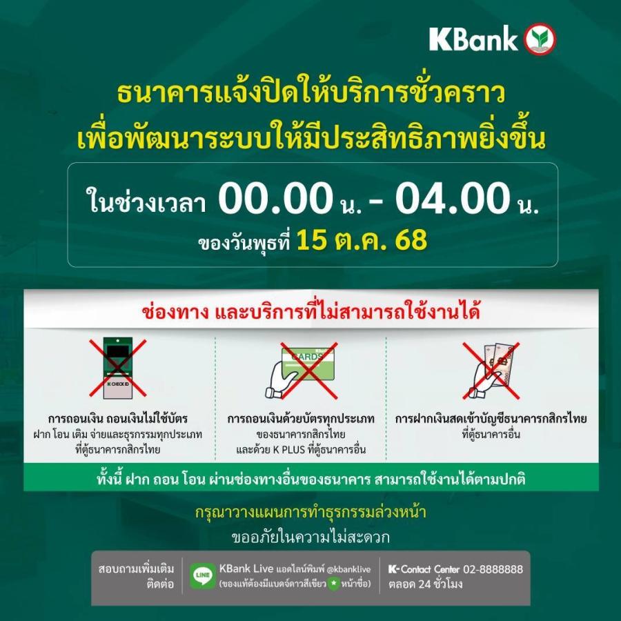 กสิกรไทยแจ้งปิดให้บริการชั่วคราว เป็นเวลา 4 ชั่วโมง ช่วง 00.00-04.00 น. ของ 15 ต.ค. 68