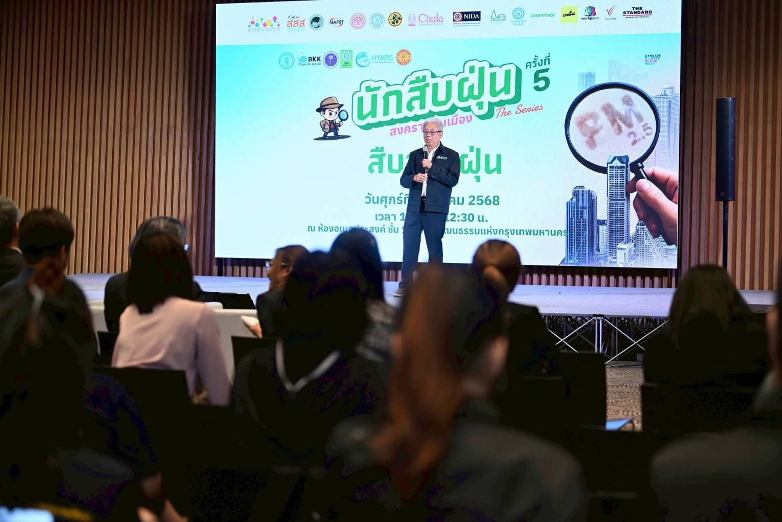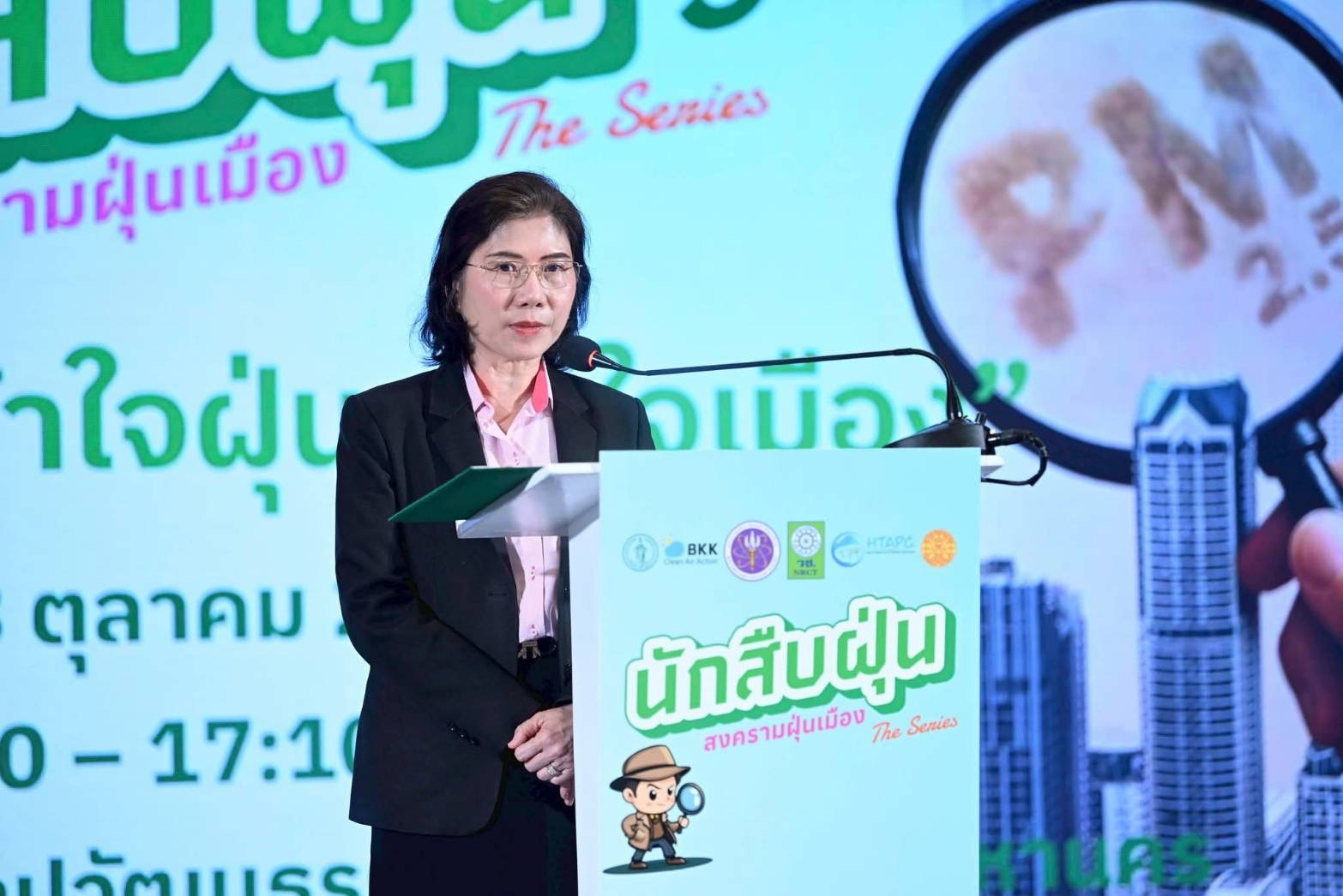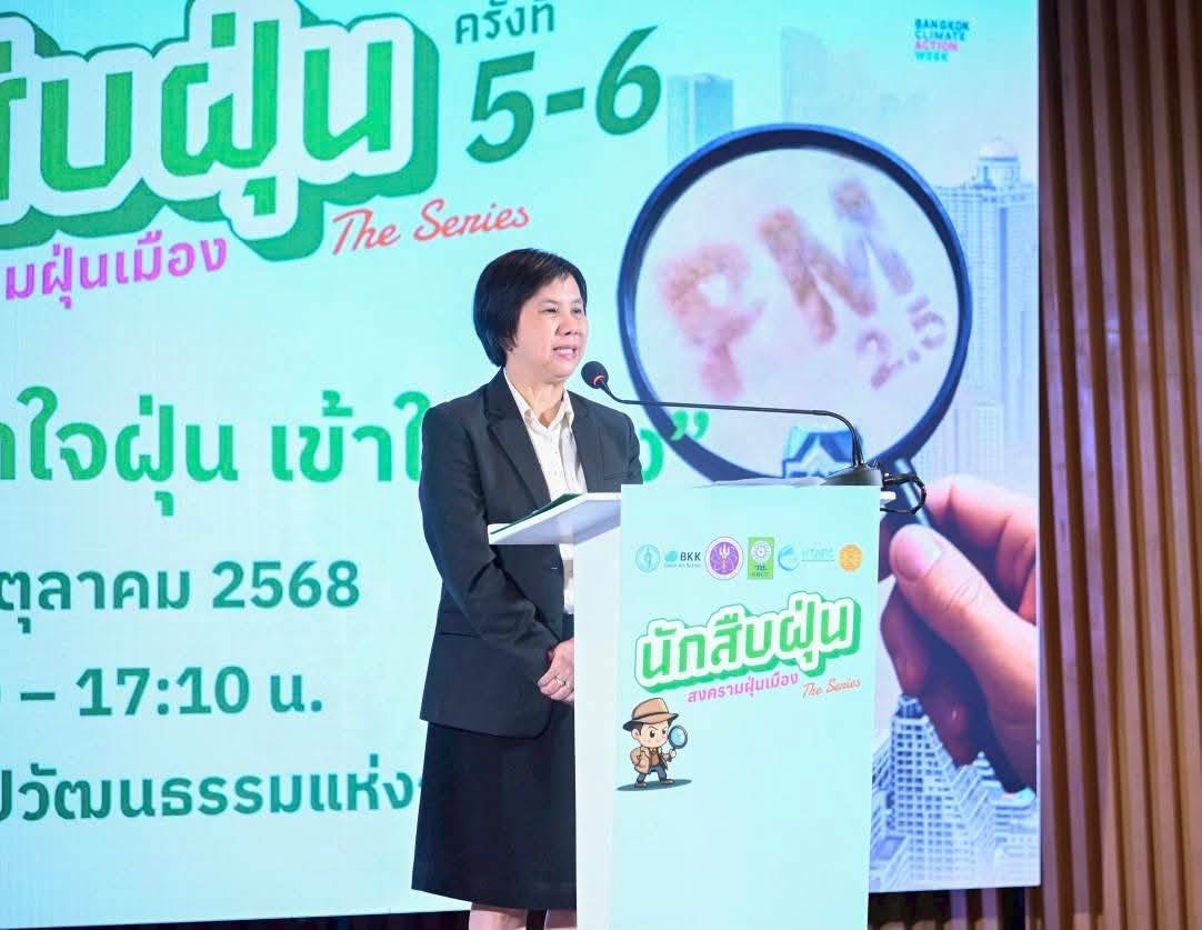 นางเลิศลักษณ์ ลีลาเรืองแสง รองปลัดกรุงเทพมหานคร กล่าวว่า ในนามของกรุงเทพมหานคร รู้สึกเป็นเกียรติและยินดีอย่างยิ่งที่ได้กล่าวต้อนรับทุกท่านในกิจกรรม “นักสืบฝุ่น The Series” ครั้งที่ 5 ภายใต้หัวข้อ “สืบจากฝุ่น” และครั้งที่ 6 ภายใต้หัวข้อ “เข้าใจฝุ่น เข้าใจเมือง” ในวันนี้ ซึ่งจัดขึ้นด้วยวัตถุประสงค์เดียวกัน คือเพื่อแลกเปลี่ยนเรียนรู้และร่วมกันแสวงหาทางออกต่อปัญหาฝุ่น PM2.5 และหมอกควัน ที่ยังคงเป็นวิกฤตสำคัญของประเทศไทยโดยเฉพาะในเขตเมืองใหญ่อย่างกรุงเทพฯ ช่วงเช้า เน้นการศึกษาความซับซ้อนของฝุ่น ตั้งแต่แหล่งกำเนิด ยานพาหนะ องค์ประกอบฝุ่นในระดับความสูงต่าง ๆ ไปจนถึงกลไกการเกิดมลพิษทุติยภูมิ ส่วนช่วงบ่าย เน้นการทำความเข้าใจปัญหาจากมุมมองของประชาชน กรุงเทพมหานคร ขอขอบคุณ วช. ที่ให้การสนับสนุนองค์ความรู้และทุนวิจัยในโครงการที่เกี่ยวข้องกับปัญหาฝุ่นในกรุงเทพฯ รวมทั้งพันธมิตรทุกภาคส่วนที่ร่วมกันขับเคลื่อนกิจกรรม “นักสืบฝุ่น The Series” ครั้งที่ 5 และ