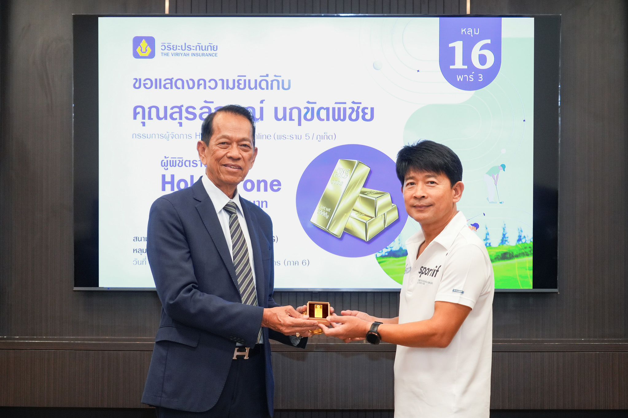นายสุรลักษณ์ นฤขัตพิชัย กรรมการผู้จัดการ Hyundai Streamline (พระราม 5 และภูเก็ต) รับมอบรางวัลทองคำหนัก 10 บาท จาก บริษัท วิริยะประกันภัย จำกัด (มหาชน) โดยได้รับเกียรติจาก นายสยม โรหิตเสถียร รองกรรมการผู้จัดการ เป็นผู้แทนมอบ เพื่อแสดงความยินดีเนื่องในโอกาสที่สามารถทำ Hole in One หลุม 16 พาร์ 3 ระยะ 185 หลา ของสนามกอล์ฟ The Royal Gems Golf City ได้สำเร็จ ภายในการแข่งขัน “ViriyahInvitational Golf Tournament 2025” โซนกรุงเทพฯ และปริมณฑล โดยพิธีมอบจัดขึ้น ณ บริษัท วิริยะประกันภัย จำกัด (มหาชน) สำนักงานใหญ่ ถนนรัชดาภิเษก กรุงเทพฯ