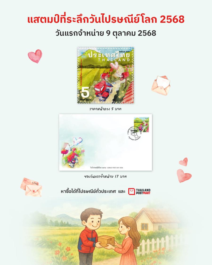 กรุงเทพฯ 7 ตุลาคม 2568 - บริษัท ไปรษณีย์ไทย จำกัด เปิดตัวแสตมป์ที่ระลึกชุดวันไปรษณีย์โลก 2568 ภายใต้แนวคิด “ส่งทุกความสัมพันธ์สู่ทุกความสำเร็จ” ถ่ายทอดผ่านผลงานการออกแบบของ น.ส.กนกวรรณ สาริพันธ์ เยาวชนคนรุ่นใหม่ที่ได้รับรางวัลรองชนะเลิศอันดับ 2 จากการประกวดออกแบบแสตมป์และผลิตภัณฑ์ต้นแบบ Prototype โดยนำเสนอภาพบุรุษไปรษณีย์ขี่จักรยานยนต์ส่งพัสดุ ซึ่งสะท้อนบทบาทสำคัญและความทุ่มเทของไปรษณีย์ไทยในการเชื่อมโยงผู้ส่งและผู้รับให้ใกล้ชิดกันมากขึ้น ทั้งในมิติชีวิตประจำวัน เศรษฐกิจ และสังคมโลก โดยแสตมป์ที่ระลึกชุดนี้ จำหน่ายราคาดวงละ 5 บาท 1 แผ่นมี 10 ดวง ซองวันแรกจำหน่ายราคา 17 บาท ผู้สนใจสามารถซื้อได้ที่พิพิธภัณฑ์แสตมป์ไทยสามเสนใน (BTS สะพานควาย) รวมถึงที่ทำการไปรษณีย์ในกรุงเทพฯ และทุกจังหวัด เริ่มจำหน่ายวันแรก 9 ต.ค. 68 นี้ ซึ่งตรงกับวันไปรษณีย์โลก (World Post Day)