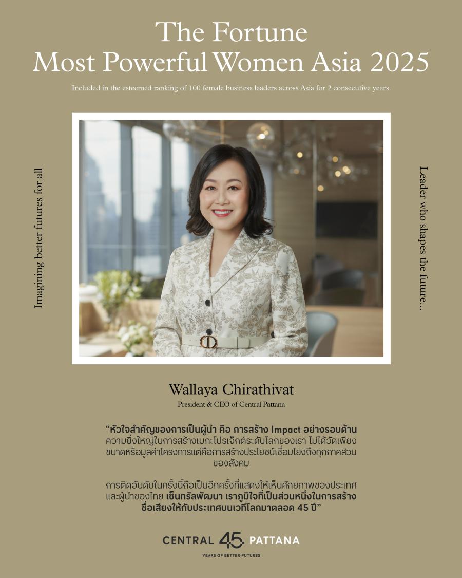 กรุงเทพฯ – บริษัท เซ็นทรัลพัฒนา จำกัด (มหาชน) ผู้นำเบอร์หนึ่งอสังหาริมทรัพย์ไทยเพื่อความยั่งยืน ภายใต้วิสัยทัศน์ Imagining better futures for all เชื่อมโยงทุกธุรกิจทั้ง Retail-Residence-Hotel-Office โดย “วัลยา จิราธิวัฒน์”CEO เซ็นทรัลพัฒนา สร้างชื่อเสียงให้ประเทศ ติดอันดับ The Fortune Most Powerful Women Asia 2025 ต่อเนื่องเป็นปีที่ 2 ในฐานะหนึ่งใน 100ผู้นำหญิงทรงอิทธิพลแห่งเอเชีย จัดอันดับโดย Fortune สื่อธุรกิจระดับโลก สะท้อนถึงบทบาทของผู้นำไทยบนเวทีระดับโลก และวิสัยทัศน์องค์กรผู้นำอสังหาริมทรัพย์ไทยของเซ็นทรัลพัฒนาที่พลิกโฉมกรุงเทพฯ บุกเบิกย่านและเมืองสำคัญทั่วประเทศ