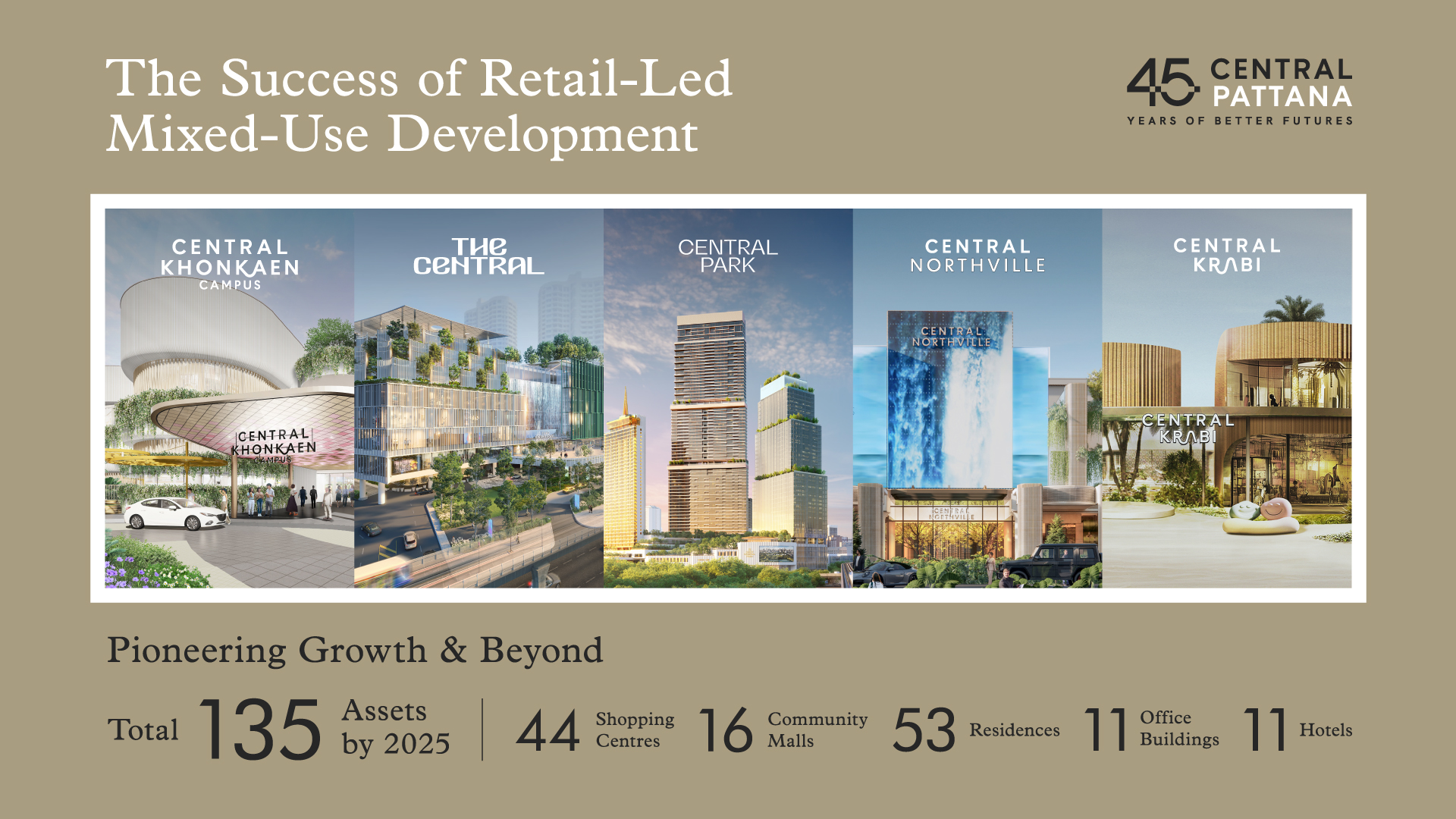 ตลอด 45 ปีที่ผ่านมา เซ็นทรัลพัฒนาเติบโตเคียงข้างลูกค้า คู่ค้า พนักงาน และชุมชน ด้วยกลยุทธ์ Retail-Led Mixed-Use Development ที่ไม่เพียงสร้างแลนด์มาร์ก แต่ยังสร้างชีวิต สร้างโอกาส และสร้างอนาคตที่ดีให้กับทุกคน ทั้งนี้เซ็นทรัลพัฒนาเดินหน้าแผนการลงทุนกว่า 120,000 ล้านบาทใน 5 ปี (2568-2572) เพื่อเปิดตัวเมกะโปรเจ็กต์และโครงการใหม่ทั่วประเทศ โดยโครงการ‘Central Park’ ได้เปิดตัวและสร้างปรากฏการณ์ Par Life & Urban Life Integration อย่างยิ่งใหญ่ไปแล้ว และในเดือน ต.ค. 68 นี้ เตรียมเปิดโครงการ Central Krabi มิกซ์ยูสยิ่งใหญ่แห่งแรกของกระบี่พร้อมส่งเสริมด้าน Sustainable Tourism สอดคล้องกับนโยบายของเมือง และตามด้วยเมกะโปรเจ็กต์ในแผนงาน นำโดย ‘The Central’ พหลโยธิน ที่จะพลิกโฉมย่านให้กลายเป็น New CBD แห่งใหม่ของกรุงเทพฯ