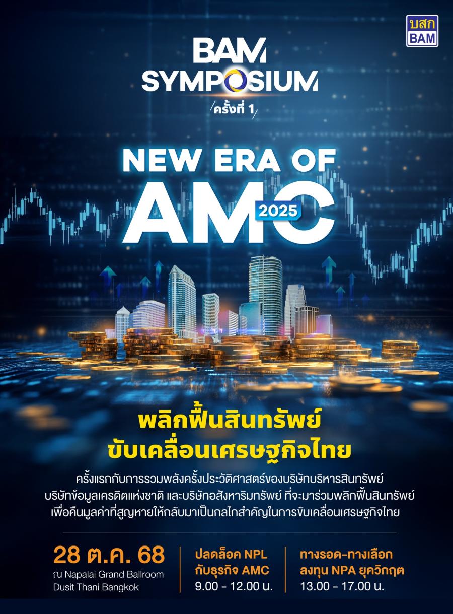 BAM ในฐานะผู้นำธุรกิจ AMC เตรียมจัดงานสัมมนาครั้งประวัติศาสตร์ BAM SYMPOSIUM : New Era of AMC 2025ด้วยการผนึกกำลังหน่วยงานสำคัญไม่ว่าจะเป็นบริษัทบริหารสินทรัพย์ บริษัทข้อมูลเครดิตแห่งชาติ และบริษัทอสังหาริมทรัพย์ชั้นนำ มาร่วมแสดงวิสัยทัศน์การบริหารจัดการ NPLs และการลงทุน NPAs ในมิติใหม่ สำหรับงานเวทียิ่งใหญ่ที่สุดแห่งปีของธุรกิจ AMC ในวันที่ 28 ตุลาคม 2568