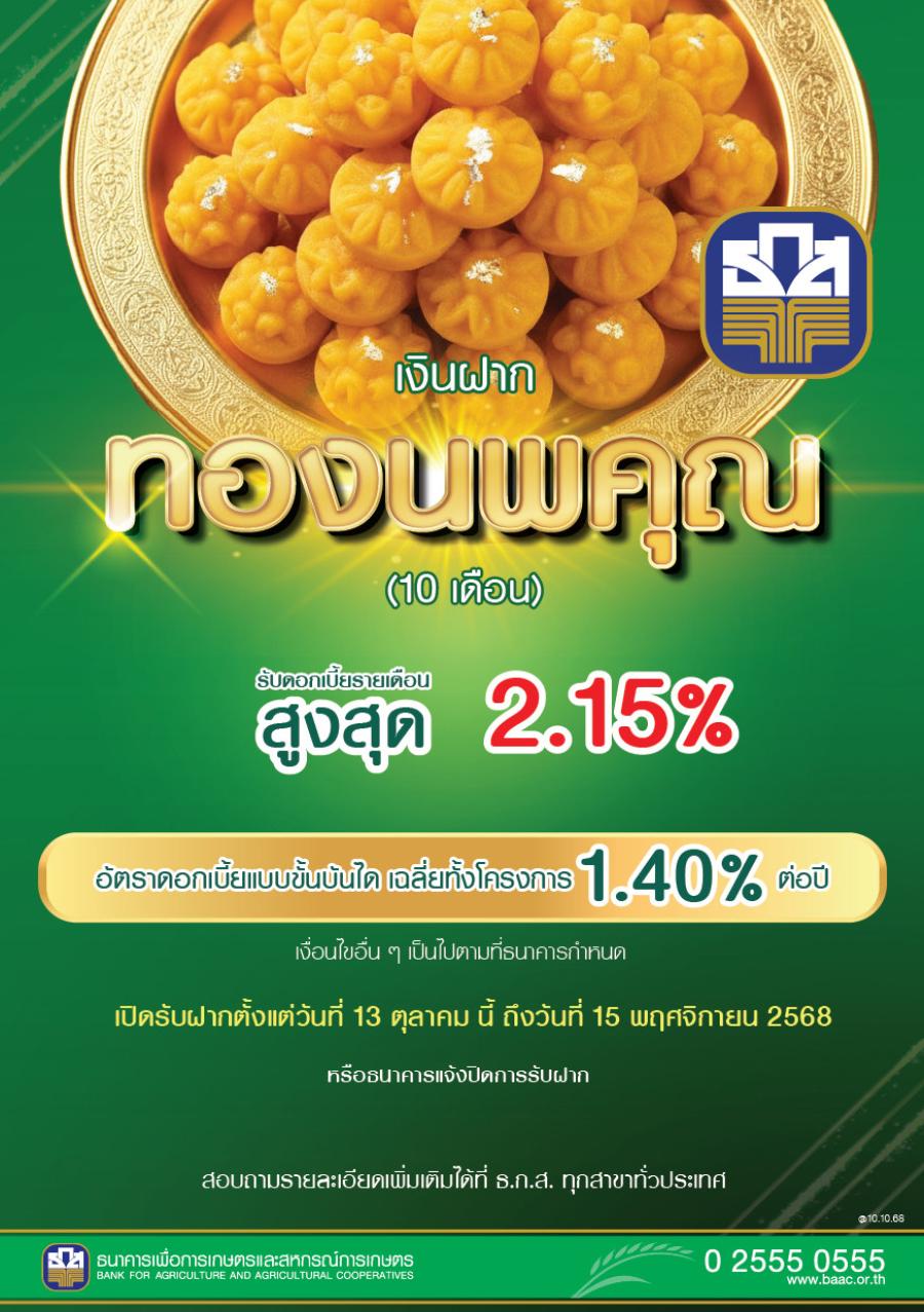 นายไพศาล หงษ์ทอง รองผู้จัดการธนาคารเพื่อการเกษตรและสหกรณ์การเกษตร (ธ.ก.ส.) เปิดเผยว่าธ.ก.ส. เปิดตัวเงินฝากทองนพคุณ เพื่อส่งเสริมพฤติกรรมการออมให้กับประชาชนอย่างต่อเนื่อง เมื่อฝากเงินแล้วรับดอกเบี้ยแบบขั้นบันไดสูงสุดร้อยละ 2.15 ต่อปี ระยะเวลาฝาก 10 เดือน แบ่งอัตราดอกเบี้ยเป็น 3 ช่วง ประกอบด้วยช่วงที่ 1 ตั้งแต่ 13 ตุลาคม 2568 ถึง 15 เมษายน 2569 อัตราดอกเบี้ยร้อยละ 1.30 ต่อปี ช่วงที่ 2 ตั้งแต่วันที่ 16 เมษายน 2569 – 15 กรกฎาคม 2569 อัตราดอกเบี้ยร้อยละ 1.35 ต่อปี และช่วงที่ 3 ตั้งแต่วันที่ 16 กรกฎาคม 2569 – 13 สิงหาคม 2569 รับดอกเบี้ยสูงสุดถึงร้อยละ 2.15 ต่อปี เฉลี่ยทั้งโครงการ ร้อยละ 1.40 ต่อปี (เทียบเท่าอัตราดอกเบี้ยเงินฝากประจำ ร้อยละ 1.65 ต่อปี) ฝากขั้นต่ำครั้งละ 10,000 บาท วงเงินฝากรวมสูงสุดไม่เกิน 100 ล้านบาทต่อราย สำหรับบุคคลธรรมดาไม่เสียภาษีดอกเบี้ยเงินฝากอีกด้วย