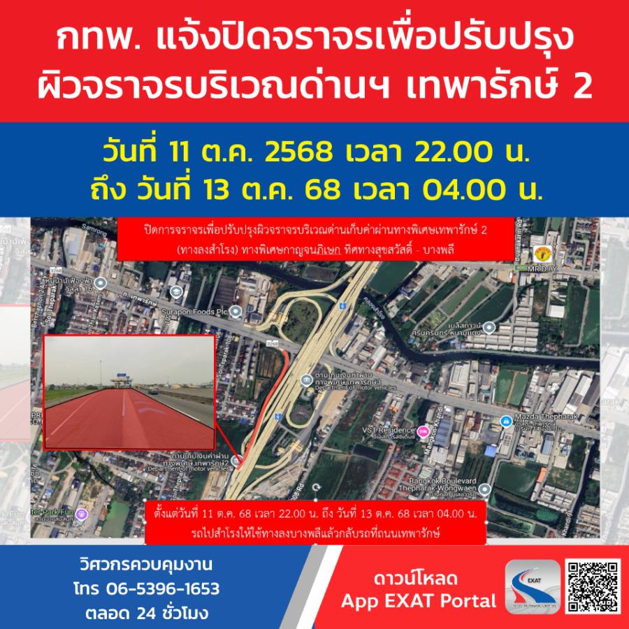 การทางพิเศษแห่งประเทศไทย (กทพ.) กระทรวงคมนาคม ได้ว่าจ้าง บริษัท ซีโก้ทรานสปอร์ต จำกัด เพื่อดำเนินงานปรับปรุงผิวจราจรถนนบริการ ในเขตทางพิเศษกาญจนาภิเษก (บางพลี-สุขสวัสดิ์) โดยบริษัทฯ จะเข้าดำเนินงานปรับปรุงผิวจราจรดังกล่าว จึงมีความจำเป็นจะต้องปิดการจราจรบริเวณด่านเก็บค่าผ่านทางพิเศษเทพารักษ์ 2 (ทางลงสำโรง) ทางพิเศษกาญจนาภิเษก (ทิศทางสุขสวัสดิ์ - บางพลี) ตั้งแต่วันที่ 11 ตุลาคม 2568 เวลา 22.00 น. ถึงวันที่ 13 ตุลาคม 2568 เวลา 04.00 น. โดยรถที่ต้องการไปสำโรง ให้ใช้ทางลงบางพลีแล้วกลับรถที่ถนนเทพารักษ์