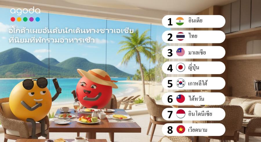 กรุงเทพฯ, ประเทศไทย, 7 ตุลาคม พ.ศ.2568 – ในปีนี้กระแสการเดินทางเพื่อลิ้มลองรสชาติอาหารกำลังมาแรงเป็นอย่างมากทั่วเอเชีย อโกด้า แพลตฟอร์มดิจิทัลด้านการท่องเที่ยวเผยอันดับประเทศที่นักเดินทางนิยมเลือกที่พักที่มีบริการอาหารเช้ารวมอยู่ด้วยมากที่สุด จากข้อมูลการค้นหาบนเว็บไซต์อโกด้าในเดือนสิงหาคมที่ผ่านมา พบว่า 13% ของผู้ใช้งานชาวไทย ใช้ตัวกรอง “รวมอาหารเช้า” ขณะค้นหาที่พัก ส่งผลให้ประเทศไทยติดอันดับ 2 ของภูมิภาคเอเชีย เป็นนักเดินทางที่นิยมที่พักรวมอาหารเช้า รองจาก นักเดินทางชาวอินเดีย ซึ่งมีอัตราการใช้ตัวกรองนี้อยู่ที่ 14%