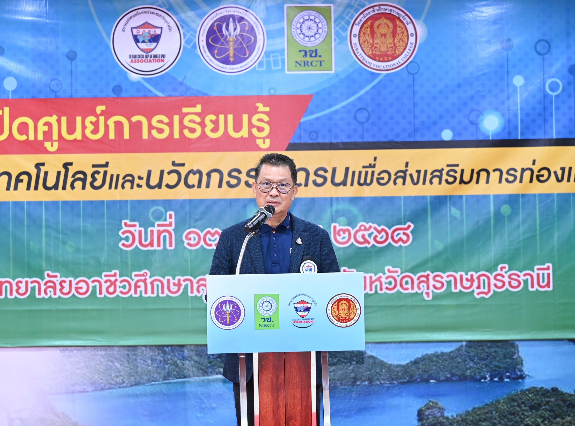 วันที่ 13 ตุลาคม 2568 สำนักงานการวิจัยแห่งชาติ(วช.) กระทรวงการอุดมศึกษา วิทยาศาสตร์ วิจัยและนวัตกรรม โดย ดร.วิภารัตน์ ดีอ่อง ผู้อำนวยการสำนักงานการวิจัยแห่งชาติ เป็นประธานเปิด “ศูนย์การเรียนรู้เทคโนโลยีและนวัตกรรมโดรนเพื่อส่งเสริมการท่องเที่ยว” โดยมี อาจารย์พงษ์ศักดิ์ นุ้ยเจริญ ผู้อำนวยการวิทยาลัยอาชีวศึกษาสุราษฎร์ธานี ให้การต้อนรับ พร้อมด้วยผู้ทรงคุณวุฒิจาก วช. และ อาจารย์พิศิษฐ์ มิตรเกื้อกูล นายกสมาคมกีฬาเครื่องบินจำลองและวิทยุบังคับ ตลอดจนคณะผู้บริหาร สื่อมวลชน และแขกผู้มีเกียรติ เข้าร่วมในพิธี ณ วิทยาลัยอาชีวศึกษาสุราษฎร์ธานี จังหวัดสุราษฎร์ธานี