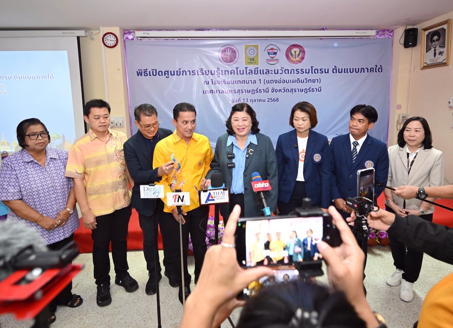 วันที่ 13 ตุลาคม 2568 สำนักงานการวิจัยแห่งชาติ (วช.) กระทรวงการอุดมศึกษา วิทยาศาสตร์ วิจัยและนวัตกรรม โดย ดร.วิภารัตน์ ดีอ่อง ผู้อำนวยการสำนักงานการวิจัยแห่งชาติ เป็นประธานในพิธีเปิด ”ศูนย์การเรียนรู้เทคโนโลยีและนวัตกรรมโดรน ต้นแบบภาคใต้” ในการนี้ได้รับเกียรติจาก นายทัศนัย เรืองนุ้ย รองนายกเทศมนตรีนครสุราษฎร์ธานี นายนิวัฒน์ กู้เขียว ผู้อำนวยการโรงเรียนเทศบาล 1 สุราษฎร์ธานี (แตงอ่อนเผดิมวิทยา) คณะผู้ทรงคุณวุฒิจาก วช. และ อาจารย์พิศิษฐ์ มิตรเกื้อกูล นายกสมาคมกีฬาเครื่องบินจำลองและวิทยุบังคับ พร้อมด้วยผู้บริหารสถานศึกษาในพื้นที่ ให้การต้อนรับ ณ โรงเรียนเทศบาล 1 สุราษฎร์ธานี (แตงอ่อนเผดิมวิทยา) จังหวัดสุราษฎร์ธานี