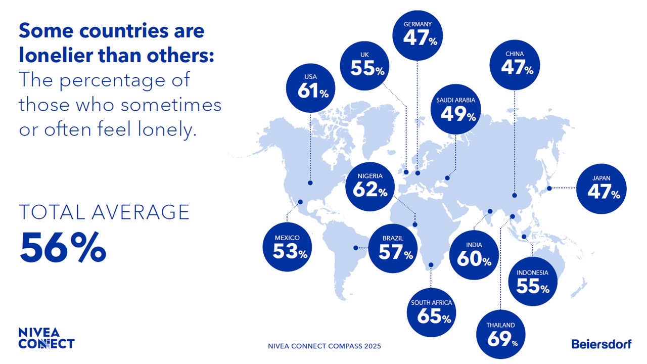 นีเวีย ได้เผยผลการวิจัย NIVEA CONNECT COMPASS เป็นครั้งแรก ซึ่งเป็นการศึกษาระดับโลกว่าด้วยความเหงาและการแยกตัวออกจากสังคม งานวิจัยนี้จัดทำขึ้นใน 13 ประเทศ ครอบคลุม 5 ทวีป พบว่าความเหงาเป็นปรากฏการณ์ระดับโลกที่ส่งผลกระทบต่อผู้คนนับล้าน และกำลังกลายเป็นวิกฤติที่สร้างผลกระทบลึกซึ้งทั้งต่อสุขภาพจิตและสุขภาพกายมากกว่าครึ่งของผู้ตอบแบบสอบถาม (56%) ยอมรับว่ามีความรู้สึกเหงาอย่างน้อยเป็นบางครั้ง 57% ระบุว่ามีช่วงเวลาที่รู้สึกว่าตนเองอยู่ลำพัง และ 54% เผชิญกับความรู้สึกว่าแยกจากผู้อื่น ขณะที่เกือบครึ่งหนึ่ง (47%) ระบุว่ารู้สึกถูกทอดทิ้งอย่างน้อยเป็นบางครั้ง
