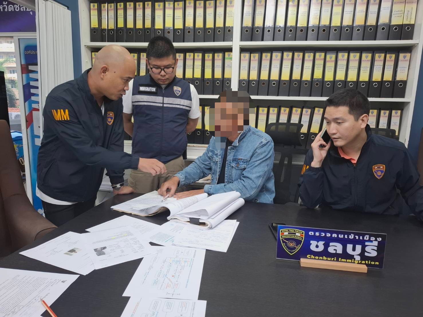 เคสที่ 2 พ.ต.อ.นภัสพงษ์ โฆสิตสุริยมณี ผกก.ตม.จว.ชลบุรี สั่งการให้ พ.ต.ท.กวิณวัชร์ อารยะสุริวงศ์ รอง ผกก.ตม.จว.ชลบุรี ร.ต.อ.พงศ์เจริญ ทองไพบูลย์ รองสว.ตม.จว.ชลบุรี ด.ต.ชัชวาล คุ้มภัย ผบ.หมู่ตม.จว.ชลบุรี ร่วมกันสืบสวนจับกุม Mr.Li (นายลี นามสมมติ) บุคคลสัญชาติจีน อายุ 56 ปี ซึ่งกระทำความผิดฐานฉ้อโกง และถูกกระทรวงความมั่นคงสาธารณะแห่งเขตซงเจียง นครเซี่ยงไฮ้ ออกประกาศสืบจับไว้