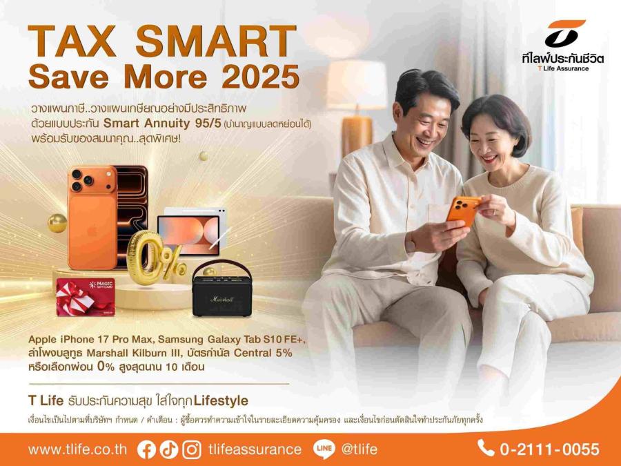 ที ไลฟ์ ประกันชีวิต ชวนวางแผนเกษียณอย่างมั่นคง พร้อมสิทธิ์ลดหย่อนภาษี กับแบบประกันบำนาญ Smart Annuity 95/5 รับ Apple iPhone 17 Pro Max หรือ Samsung Galaxy Tab S10 FE+