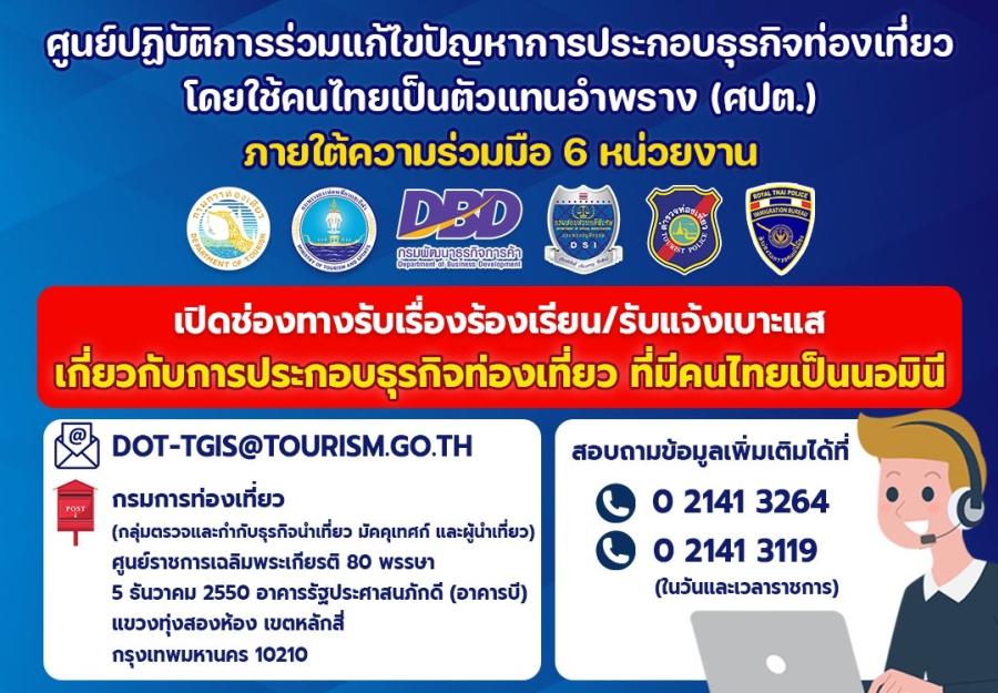 - การประกอบธุรกิจนำเที่ยวที่อาจเข้าข่ายใช้คนไทยเป็นตัวแทนอำพราง (Nominee) แจ้งได้ที่ โทร. 0 2141 3264 หรือ 0 2141 3119 และอีเมล์ dot-tgis@tourism.go.th