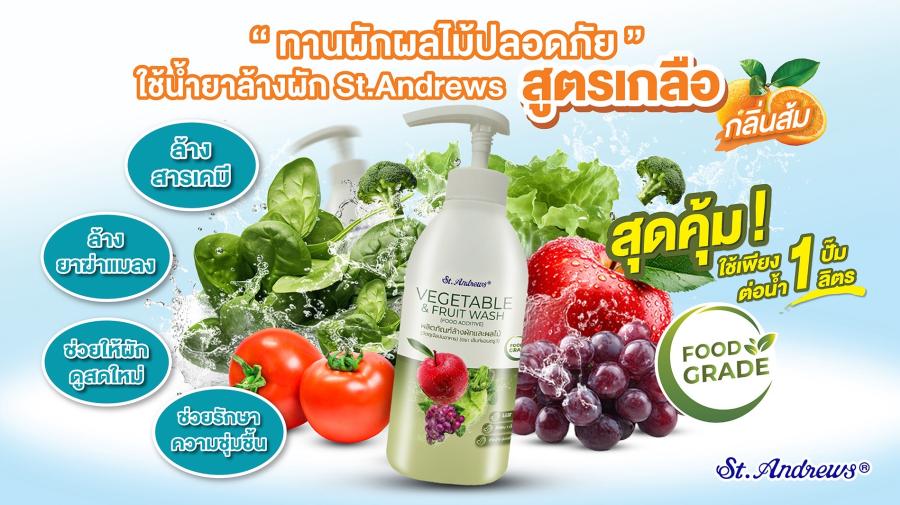 ผลิตภัณฑ์ “St.Andrews น้ำยาล้างผักและผลไม้ สูตรเกลือ Food Grade” ผ่านการทดสอบจากห้องปฏิบัติการ (LAB) รับรองมาตรฐาน Food Grade ผลิตจากสารสกัดธรรมชาติ สูตรเกลือ และ Essential Oil หอมกลิ่นส้ม มั่นใจล้างผักผลไม้สะอาดปลอดภัย สามารถล้างสารเคมีที่ตกค้างได้