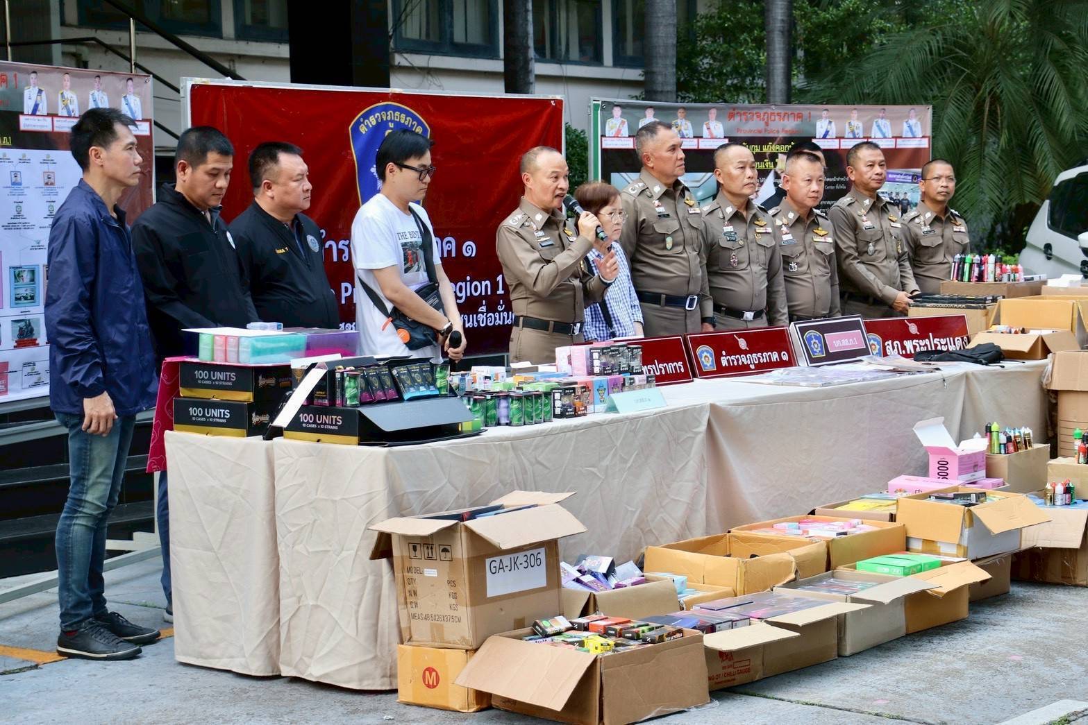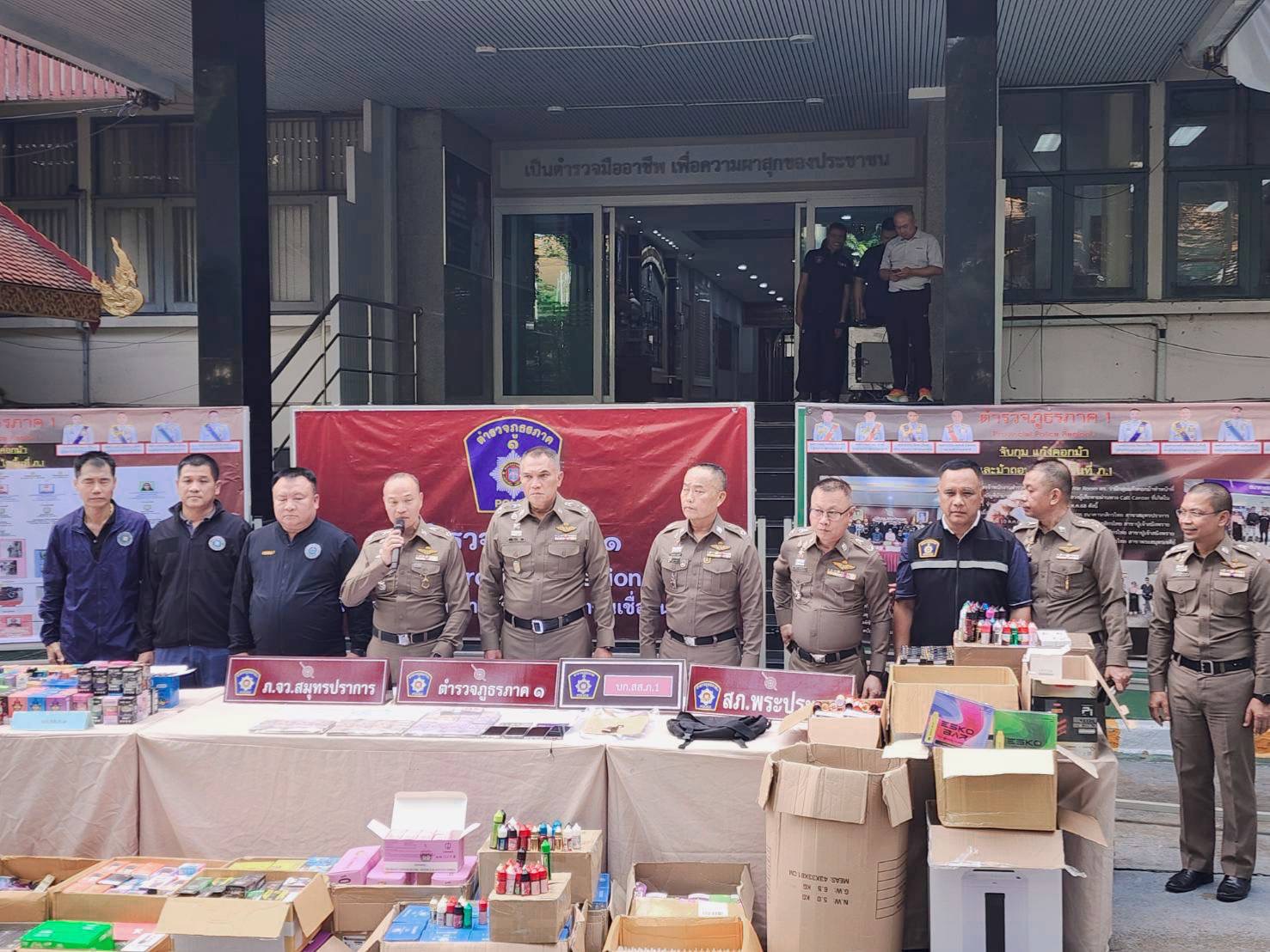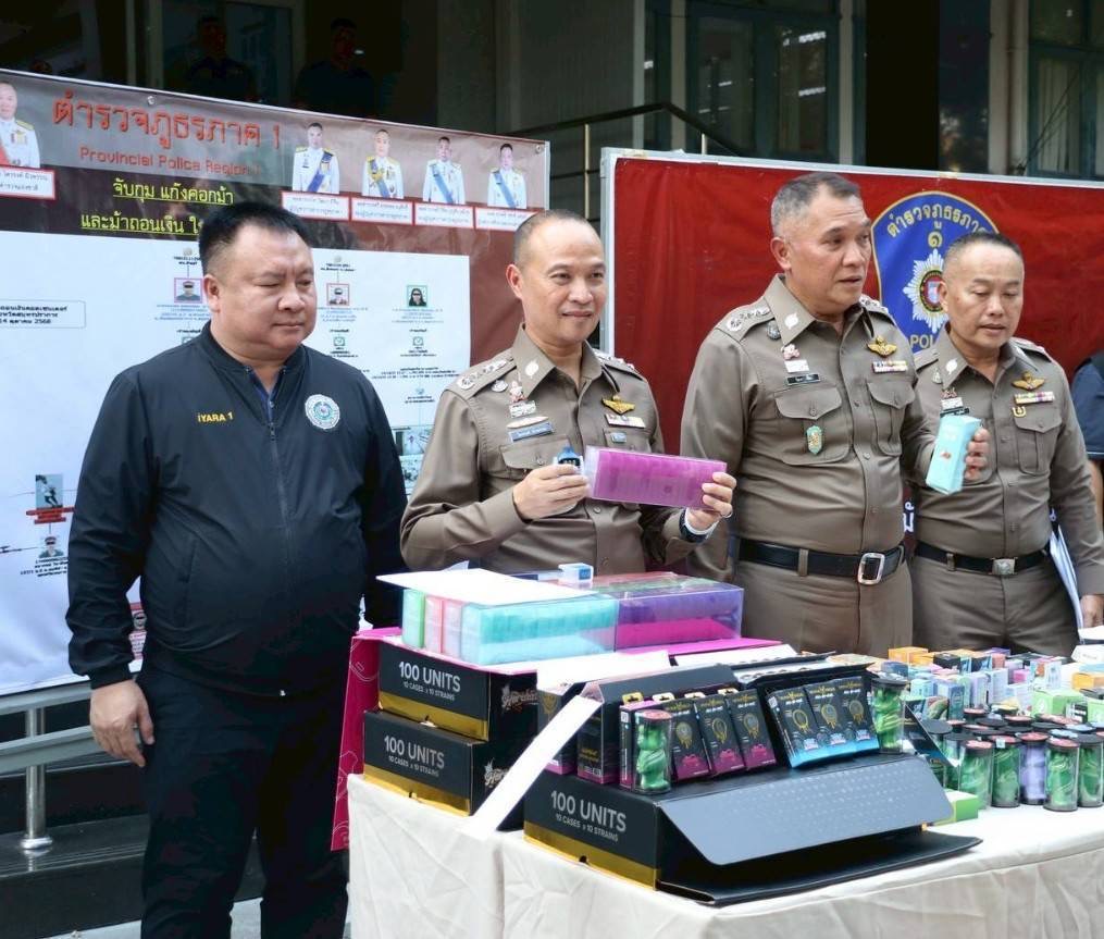 ผช.ผบ.ตร.และ ผบช.ภ.1 แถลงข่าวร่วมกันจับกุมแก๊งคลอฯพร้อมบุกยึดบุหรี่ไฟฟ้า