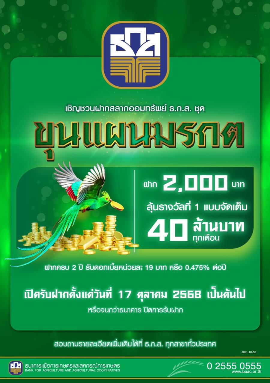 ธ.ก.ส. เปิดตัว “สลากออมทรัพย์ ธ.ก.ส. ชุดขุนแผนมรกต” หน่วยละ 2,000 บาท ลุ้นโชคใหญ่ทุกเดือน มูลค่า 40 ล้านบาท และรางวัลอื่น ๆ จำนวน 1 แสนรางวัล รวมมูลค่ากว่า 72 ล้านบาทต่อเดือน ถึง 24 ครั้ง แบ่งเป็น 5 หมวด หมวดละ 10 ล้านหน่วย จำนวน 100,000 ล้านบาท เมื่อฝากครบ 2 ปี ได้รับดอกเบี้ยทันทีหน่วยละ 19 บาท หรือคิดเป็น 0.475% และฝาก 1,000 หน่วยขึ้นไป การันตีถูกรางวัลทุกงวด ดอกเบี้ยและ