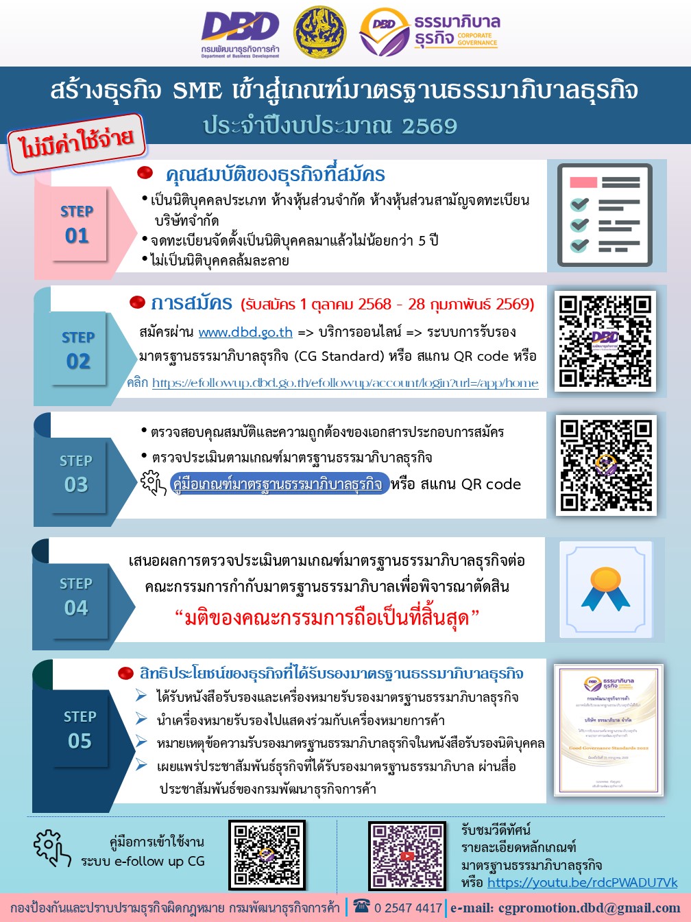 กรมพัฒนาธุรกิจการค้า กระทรวงพาณิชย์ ขอเชิญชวนผู้ประกอบการ SME สมัครเข้าร่วมโครงการ ‘สร้างธุรกิจ SME เข้าสู่เกณฑ์มาตรฐานธรรมาภิบาลธุรกิจ’ประจำปีงบประมาณ 2569 เพื่อยกระดับธุรกิจให้มีความโปร่งใส น่าเชื่อถือและเติบโตอย่างยั่งยืน ถือเป็นโอกาสสำคัญในการเสริมสร้างความเข้มแข็งให้แก่ธุรกิจ SME ไทยโดยเปิดรับสมัครแล้วตั้งแต่วันนี้ - 28 กุมภาพันธ์ 2569ฟรี!!! ไม่มีค่าใช้จ่าย