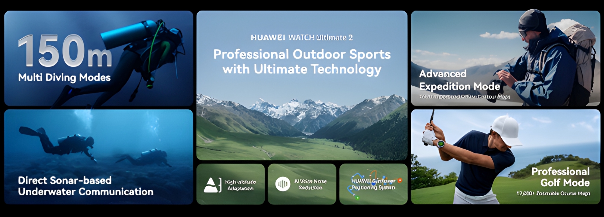 โดดเด่นด้วยความสามารถในการสวมใส่ดำน้ำลึกได้ สูงสุด 150 เมตร พร้อมระบบสื่อสารใต้น้ำที่ช่วยให้ผู้ใช้ส่งข้อความหรืออีโมจิผ่านคลื่นโซนาร์ได้ในระยะ 30 เมตร และสูงสุด 60 เมตรเมื่อเข้าใช้งานฟีเจอร์ SOS เสริมความปลอดภัยด้วยฟีเจอร์ขอความช่วยเหลือฉุกเฉินจากใต้น้ำ ตอบโจทย์นักดำน้ำและสายผจญภัยตัวจริง สำหรับสายออกกำลังกายกลางแจ้ง หัวเว่ยเพิ่มโหมด Trail Running และExpedition Mode ที่รองรับการใช้งานแบบออฟไลน์ด้วยแผนที่นำทางกลับตามเส้นทางเดิม(Route-back) และการแจ้งเตือนความปลอดภัยเมื่ออยู่เหนือระดับความสูงกว่า 4,500 เมตร รวมถึงGolf Mode ที่ครอบคลุมกว่า 17,000 สนามทั่วโลก พร้อมระบบคำนวณระยะทางตามความชันและการมีแคดดี้ดิจิทัลส่วนตัวกับฟีเจอร์ Trajectory Replay
