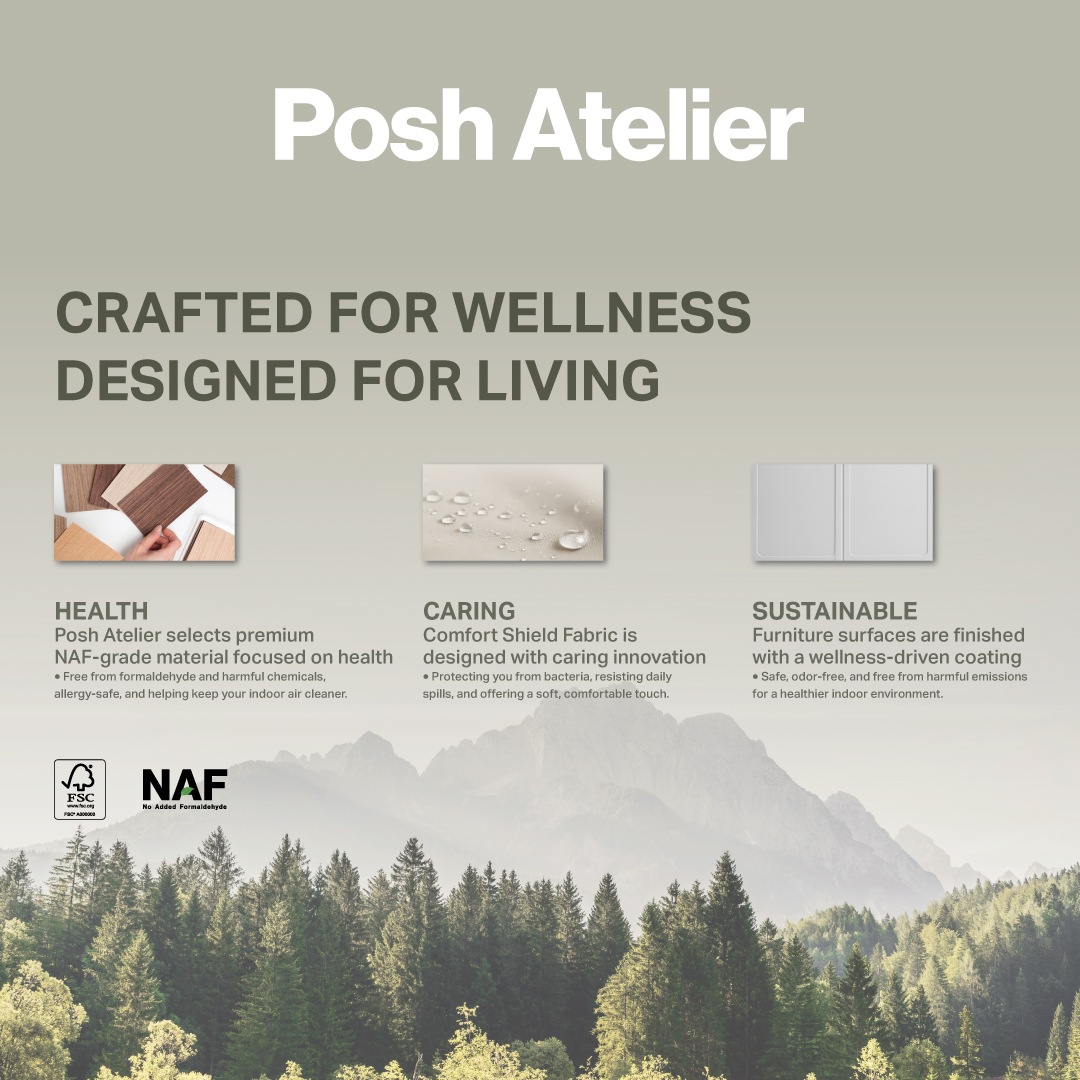การเปิดตัวคอลเลคชันใหม่ของ Posh Atelier ในครั้งนี้ ถือเป็นการขับเคลื่อน เอสบี ดีไซน์สแควร์ ให้ก้าวสู่การเป็น Value-driven Brand ที่ไม่ได้แข่งขันเพียงแค่ราคาและดีไซน์ แต่ยังนำ “คุณภาพชีวิตและความเป็นอยู่ที่ดี” (Well-being) มาเป็นแกนกลางของกลยุทธ์ ซึ่งสอดคล้องกับแนวโน้มผู้บริโภคทั่วโลกที่ให้ความสำคัญกับการสร้างสภาพแวดล้อมที่ปลอดภัยต่อสุขภาพในระยะยาว คอลเลคชันใหม่นี้มุ่งยกระดับคุณภาพชีวิตผ่านวัสดุที่ปลอดภัยและเป็นมิตรต่อสิ่งแวดล้อม โดยไฮไลท์สำคัญคือการเลือกใช้ไม้เกรดNAF (No Added Formaldehyde) ซึ่งเป็นไม้ที่ไม่มีการเติมสารฟอร์มัลดีไฮด์ในกระบวนการผลิต ทำให้อัตราการปล่อยสารระเหยอันตรายน้อยมากจนเกือบเป็นศูนย์ส่งผลให้ไม่มีกลิ่นฉุน ไม่ก่อให้เกิดภูมิแพ้ หรือการระคายเคือง และทำให้อากาศภายในบ้านสะอาดและปลอดภัย รวมถึงการใช้สีน้ำสูตรพิเศษที่ Low VOCs & Heavy Metals Free ไร้กลิ่นฉุนและสารเคมีอันตราย นอกจากนี้ยังเลือกใช้ผ้าหุ้มเตียงที่ปลอดสารเคมีอันตรายและยังเป็นมิตรต่อสิ่งแวดล้อม ซึ่งได้รับการรับรอง OEKO-TEX Standard 100 เสริมด้วยหน้าท็อปหินธรรมชาติระดับพรีเมียม ซึ่งถ่ายทอดความหรูหราในสไตล์โมเดิร์นอิตาเลียนประกอบด้วยคอลเลคชันเด่น 2 ซีรีส์ ได้แก่VELAR Collection ดีไซน์หน้าบานโค้งมนเรียบหรูในโทนสีเทาอ่อน และ BORDO Collectionโดดเด่นด้วยโทนสีดำและดีไซน์เส้น สายแนวตั้ง ที่ให้ความรู้สึกทรงพลัง นอกจากนี้ยังเสริมด้วยMotion Recliner ที่เลือกใช้ผ้าหุ้มเบาะแบบComfort Shield ที่มีคุณสมบัติพิเศษ คือ เป็นผ้ากันน้ำและแบคทีเรีย ช่วยป้องกันการเกิดเชื้อราและแบคทีเรีย ทำให้ง่ายต่อการทำความสะอาดและดูแลรักษาในชีวิตประจำวัน