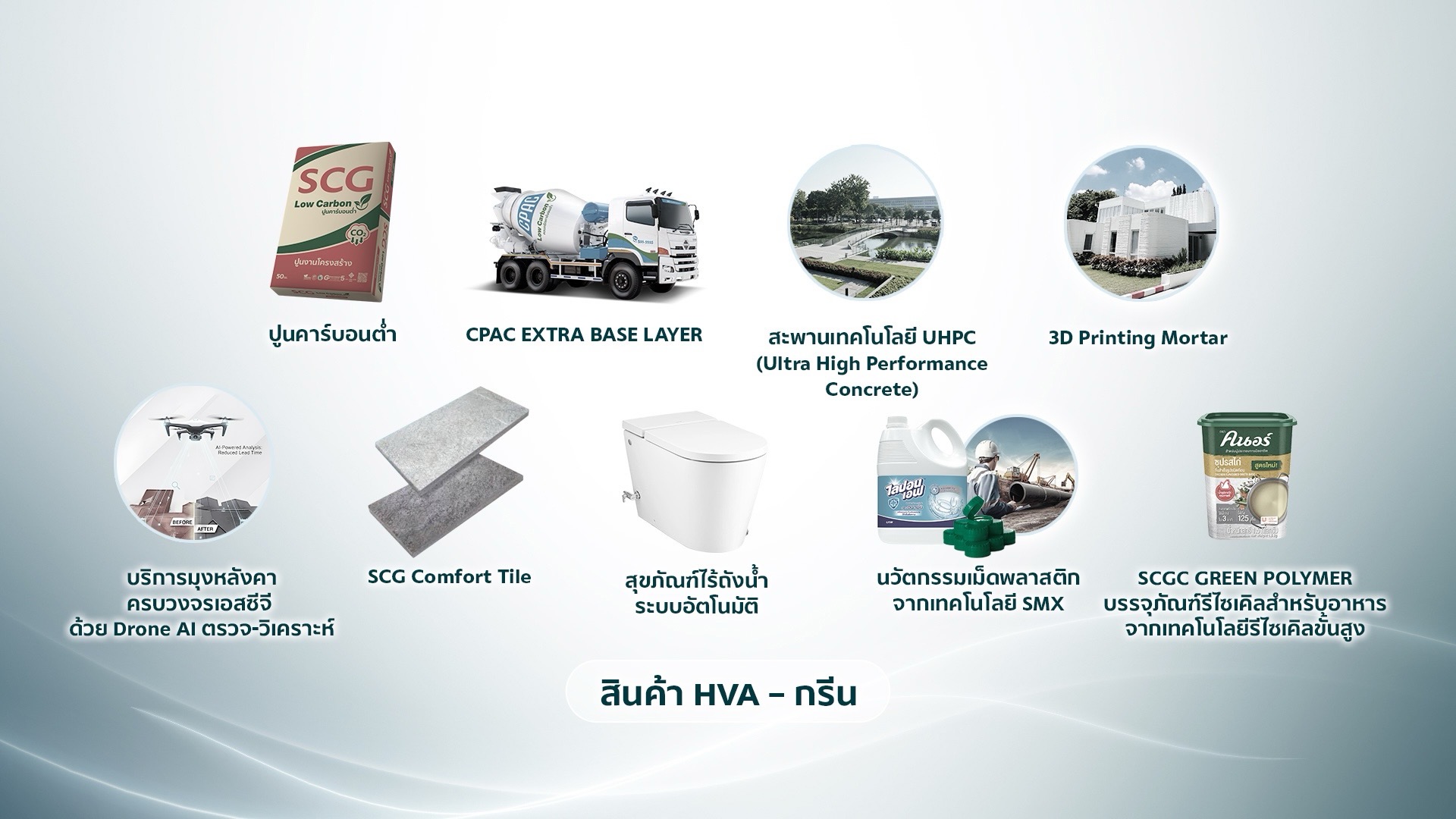 ปูนคาร์บอนต่ำ ปูนคาร์บอนต่ำ อยู่ระหว่างพัฒนาปูนคาร์บอนต่ำรุ่นใหม่ Generation 3 ที่ลดคาร์บอนไดออกไซด์ได้ถึง 38% โดยเตรียมปรับกำลังการผลิต 2 ล้านตัน/ปี ภายในปี 2570 ที่จ.สระบุรี และCPAC Extra Base Layer นวัตกรรมซ่อม-สร้างถนนลดการยุบตัวและคงตัวทนนานจากการกัดเซาะน้ำ สะพาน UHPC (Ultra High Performance Concrete)สมรรถนะสูง ลดเวลาก่อสร้างได้ถึง 50% 3D Printing Mortar เทคโนโลยีการขึ้นรูปอาคารก่อสร้างที่มีดีไซน์ซับซ้อน ขยายตลาดไปญี่ปุ่น ซาอุดิอาระเบีย และมาเลเซีย ยกระดับ Roof Installation บริการมุงหลังคาครบวงจรเอสซีจี ด้วย Drone AI ตรวจรอยรั่วหลังคาและวิเคราะห์โครงสร้างแบบ 3 มิติ ช่วยให้ซ่อมแซมรวดเร็ว ปลอดภัย และแม่นยำยิ่งขึ้น SCG Comfort Tileกระเบื้องซีเมนต์ปูพื้นรายแรกในไทย ที่ลดความร้อนสะสมได้ 3–7°C ด้วย HeatSync Technology ให้พื้นเย็น เดินสบาย สุขภัณฑ์ไร้ถังประหยัดน้ำ DUACT และแบบ“เคลือบจากเปลือกไข่–หอย” ลดการปล่อยก๊าซเรือนกระจก นวัตกรรมเม็ดพลาสติกจากเทคโนโลยี SMXช่วยลดความหนาของผลิตภัณฑ์ลงโดยยังคงความแข็งแรง พัฒนาเป็นสินค้าหลากหลาย เช่น ท่ออุตสาหกรรมเหมืองแร่ขนาดใหญ่ ฝาขวดน้ำอัดลม ถังบรรจุสารเคมี และบรรจุภัณฑ์สินค้าอุปโภคบริโภค นวัตกรรมพลาสติกรีไซเคิล ทั้งเทคโนโลยีรีไซเคิลเชิงกล และเทคโนโลยีรีไซเคิลขั้นสูง ซึ่งใช้ผลิตเป็นบรรจุภัณฑ์