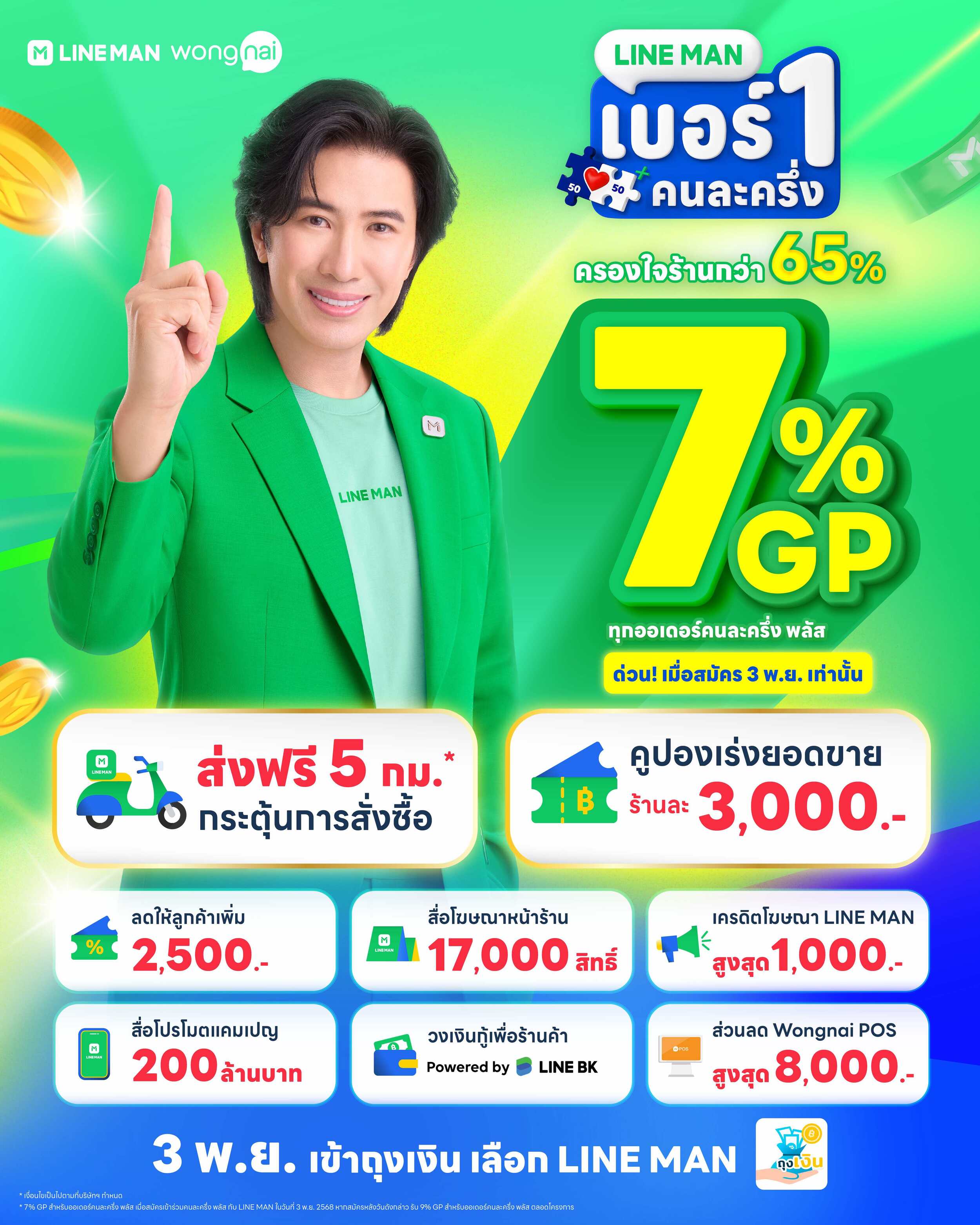 • รับ 7% GP สำหรับออเดอร์คนละครึ่งพลัส เมื่อสมัครเข้าร่วมโครงการกับ LINE MAN ในวันที่ 3 พฤศจิกายน 2568 หรือรับ 9% GP สำหรับออเดอร์คนละครึ่งพลัส ที่สมัครเข้าร่วมโครงการหลังวันดังกล่าวจนจบโครงการ