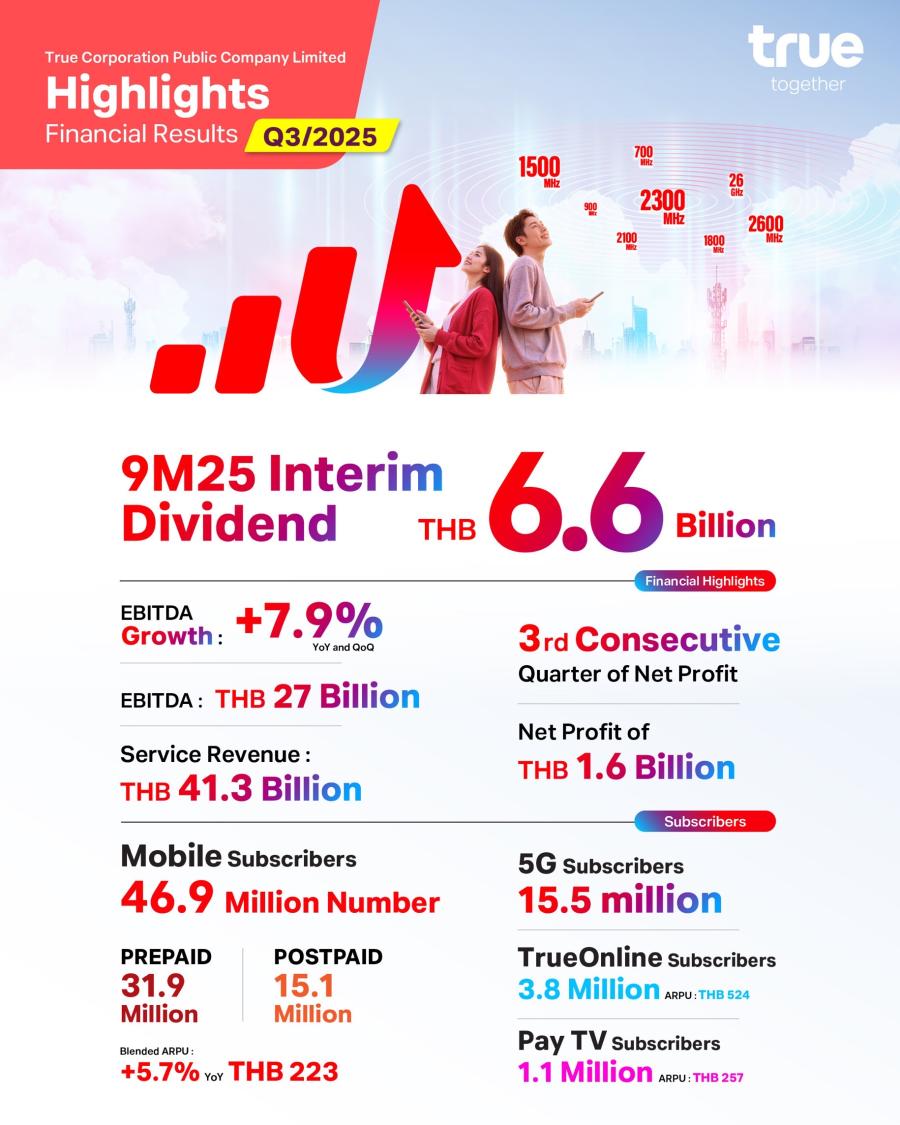 4 พฤศจิกายน 2568 - บริษัท ทรู คอร์ปอเรชั่น จำกัด (มหาชน) รายงานผลกำไรหลังหักภาษีประจำไตรมาส 3/2568 มูลค่า 1.6 พันล้านบาท ซึ่งนับเป็นการทำกำไร 3 ไตรมาสติดต่อกัน หากไม่รวมผลกระทบจากรายการที่เกิดขึ้นครั้งเดียวบริษัทฯ มีกำไรสุทธิหลังหักภาษีและหลังปรับปรุงรายการพิเศษ (Normalized Net Profit) อยู่ที่ 4.6 พันล้านบาท ในส่วน EBITDA อยู่ที่ 2.7 หมื่นล้านบาท โดยได้แรงหนุนหลักจากการได้มาซึ่งใบอนุญาตให้ใช้คลื่นความถี่ สำหรับการดำเนินงาน 9 เดือนแรกของปี 2568 บริษัทฯ ได้ประกาศจ่ายเงินปันผลระหว่างกาล จำนวน 6.6 พันล้านบาท คิดเป็นอัตราการจ่ายเงินปันผล 125%