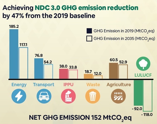 นายสุชาติ ชมกลิ่น รองนายกรัฐมนตรีและรัฐมนตรีว่าการกระทรวงทรัพยากรธรรมชาติและสิ่งแวดล้อม (รมว.ทส.) เปิดเผยว่า คณะรัฐมนตรี (ครม.) เมื่อวันที่ 4 พฤศจิกายน 2568 มีมติเห็นชอบต่อร่างเป้าหมายการมีส่วนร่วมที่ประเทศกำหนด ฉบับที่ 2 (NDC 3.0) ซึ่งเป็นก้าวสำคัญในการเร่งเป้าหมาย Net Zero ให้เร็วขึ้น 15 ปี เพื่อให้สอดคล้องกับ 1.5 ºC Pathway ตามนโยบายของรัฐบาลข้อ 13 การผลักดันสังคมคาร์บอนต่ำ ที่นายกรัฐมนตรีอนุทิน ชาญวีรกูล แถลงต่อรัฐสภา โดยมุ่งลดการปล่อยก๊าซเรือนกระจกในทุกภาคส่วนของเศรษฐกิจ (Economy-wide) ณ ปี ค.ศ. 2035 (พ.ศ. 2578) และเร่งเพิ่มเป้าหมายการดูดกลับก๊าซเรือนกระจกในภาคป่าไม้และการใช้ประโยชน์ที่ดิน (LULUCF) ซึ่งจะทำให้ประเทศไทยมีระดับการปล่อยก๊าซเรือนกระจกสุทธิ 152 MtCO2eq หรือลดลงร้อยละ 47 จากระดับการปล่อยก๊าซเรือนกระจกในปี ค.ศ. 2019 รวมถึงได้จัดทำแผนการลงทุนเพื่อดึงเม็ดเงินจากต่างประเทศ 230,000 ล้านบาท ในการสนับสนุนไทยลดก๊าซเรือนกระจก 32.8 MtCO2eq ตามเงื่อนไขของความตกลงปารีส